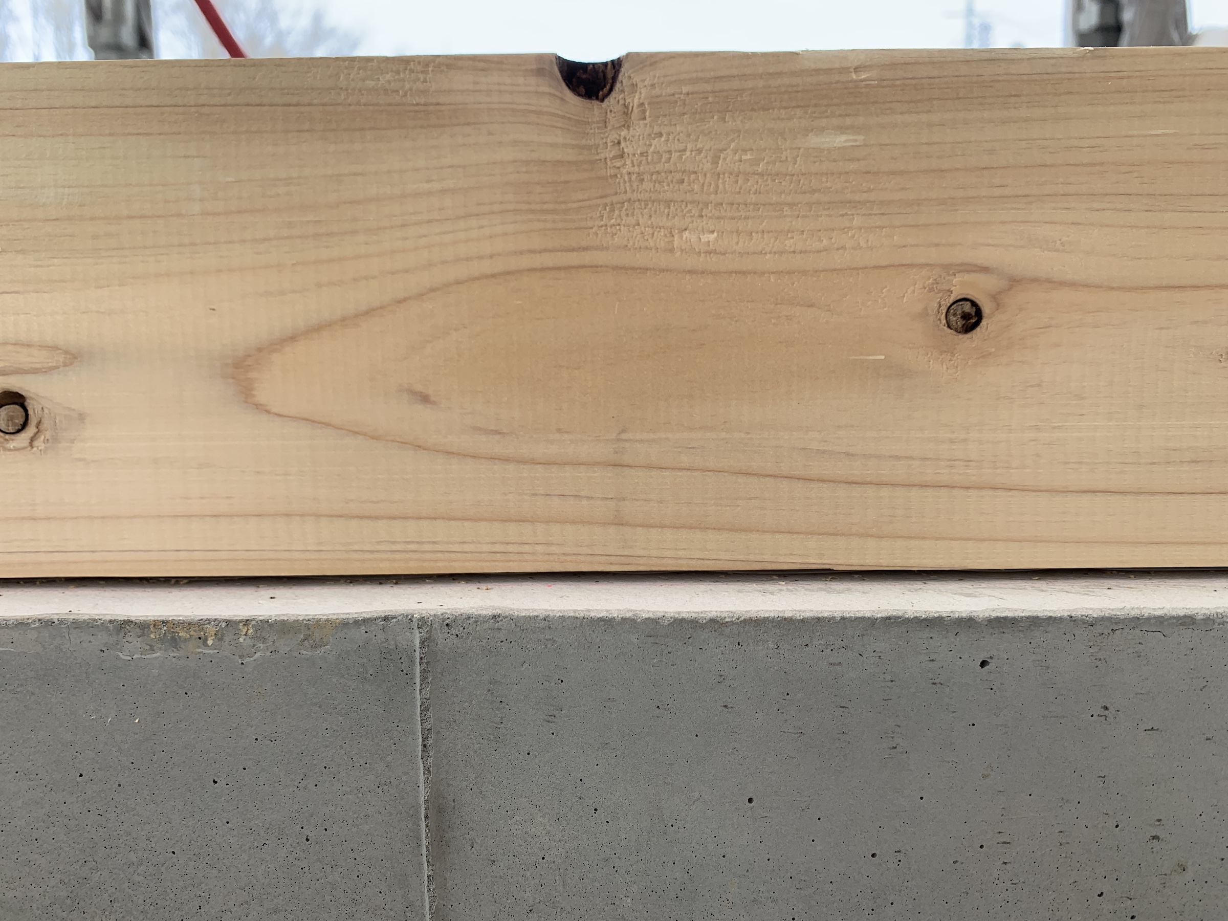 弊社ではべた基礎で基礎断熱という断熱方法を採用しております。その為基礎の下も室内と同じ扱いとなる為外気が入ってこないように施工しなくてはいけません基礎が完成し自社で検査をしますが天端の不陸は±1mm(合計3mm)以内を標準としております。その上に土台といわれる木材をボルトで固定していくのですが、基礎の不陸で大きくて3mm、木に関しても製材されているとはいえ誤差なくまっすぐ直角という事はありません。そのまま設置してしまいますと隙間が空いてしまいそこから外気の侵入を許してしまう可能性があります。その為土台と基礎の間には15mmのゴム製の部材を間に挟み、土台と基礎をボルトで締め、ゴムをつぶすことで気密を確保しています。設置後は写真で分かるように隙間があいているような見た目になります。