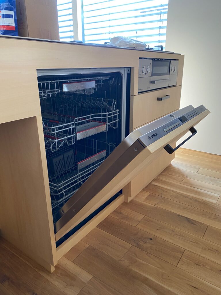 造作家具じゃないと取付できないことがほとんどでしたが、既製品のキッチンメーカーさんでも高級グレードになると海外製食洗器を選べるようになりました。
