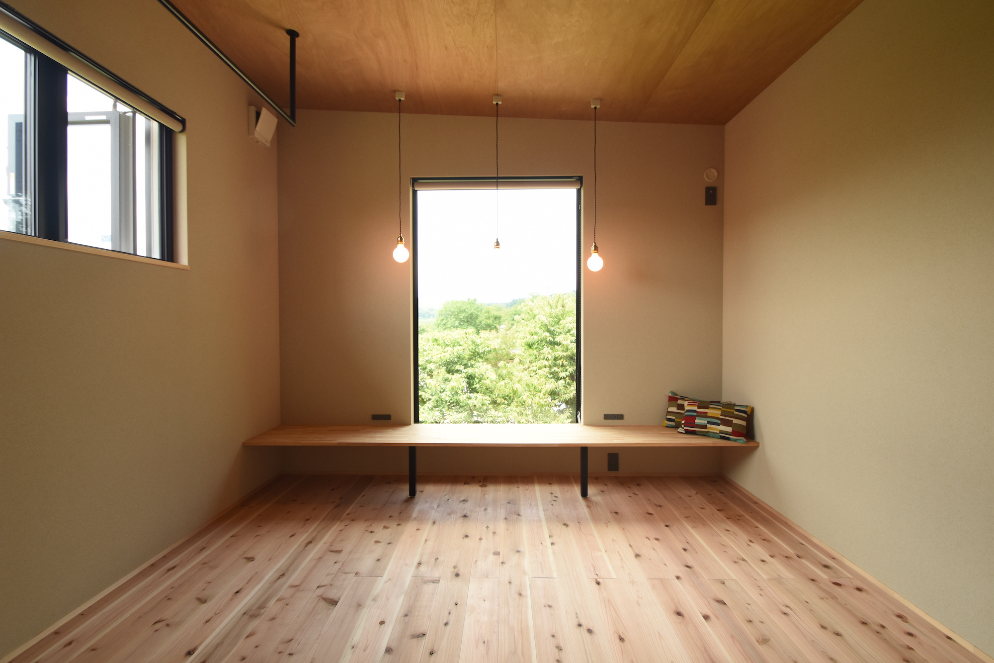 2階フリースペース。大きなFIX窓からは外の景色をまるで切り取られた絵画のように楽しめる