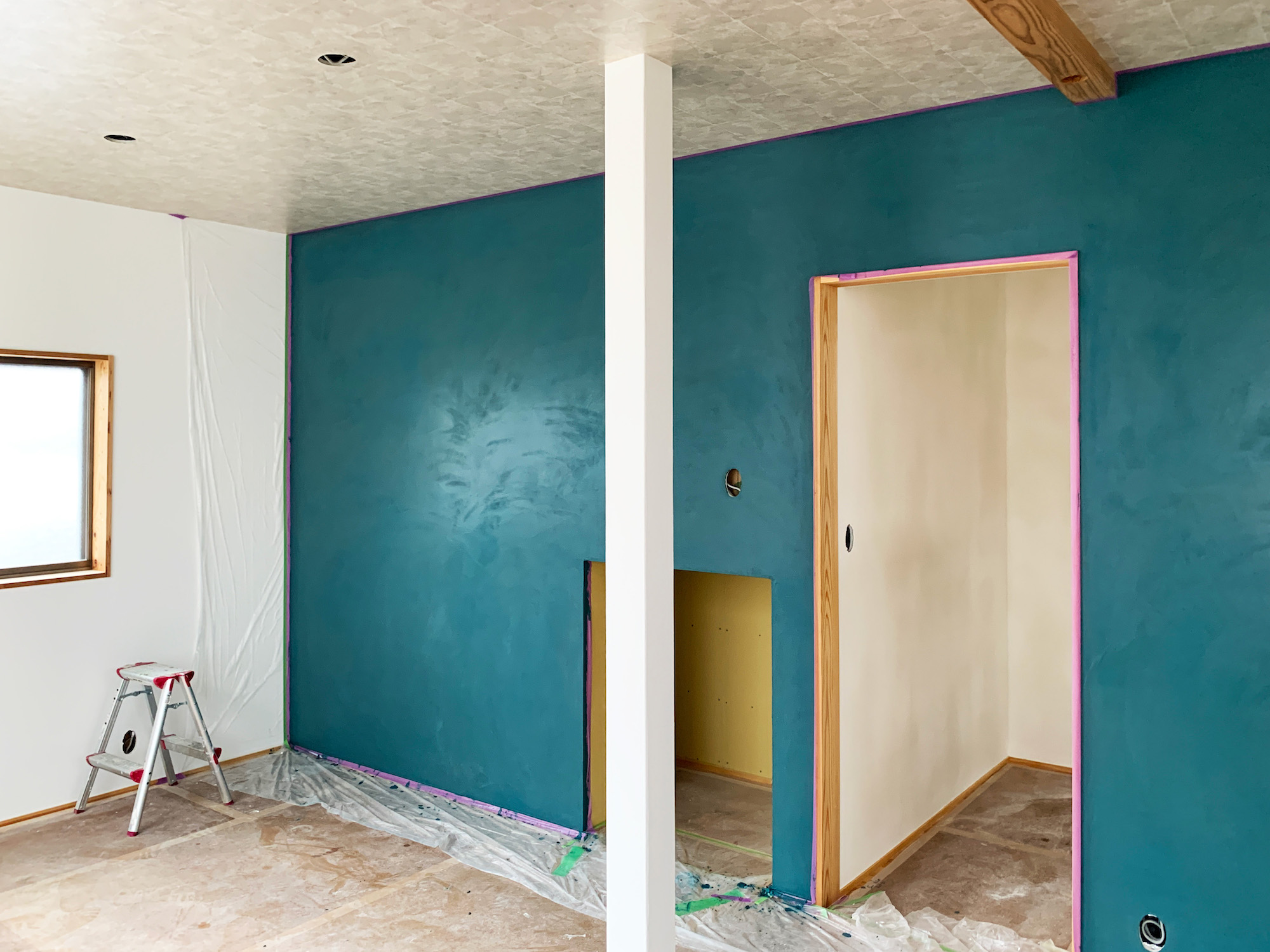 室内の壁の一部を深緑色の左官で仕上げています(工事中の写真)