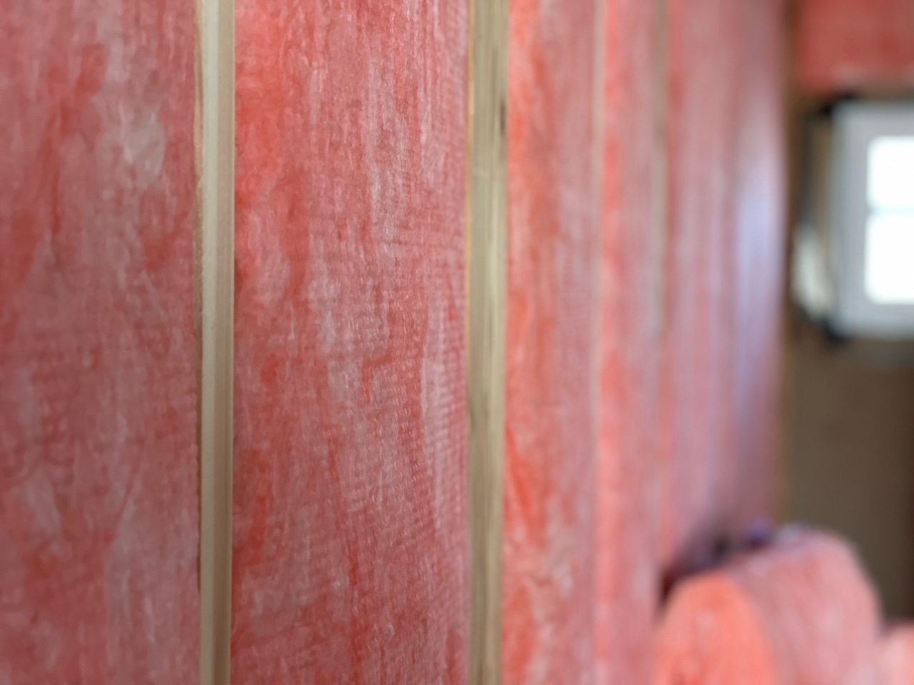 これは現在進行中の新築住宅の断熱工事の写真です。柱と柱の間に高性能グラスウールを充填しています。よく見ると柱の表面よりグラスウールが盛り上がっているのが分かるでしょうか。これは将来的に柱の木材が反ったり動いた際に隙間が生じないようにテンションを掛けた形で納めています。