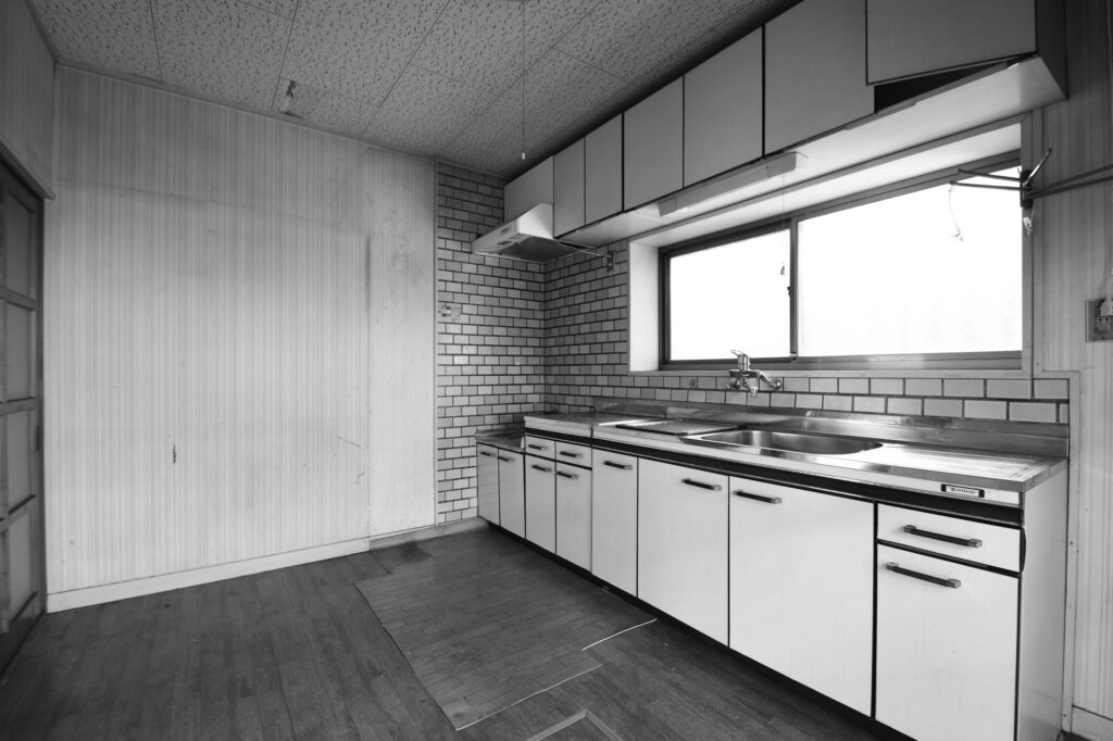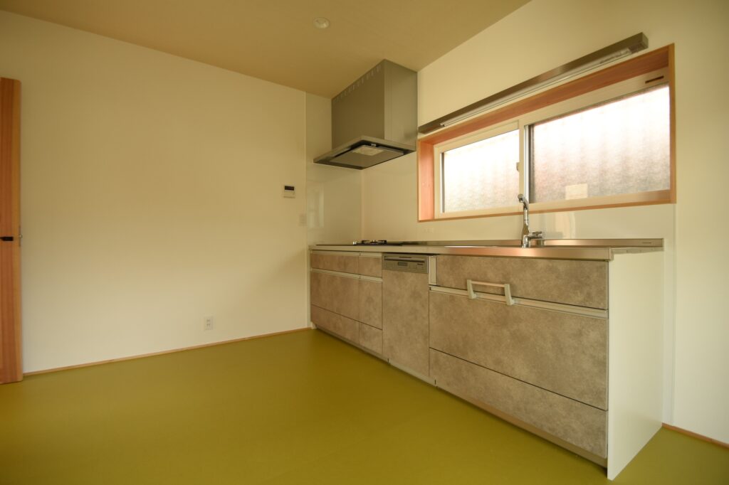 キッチンスペースは大きな間取りの変更はせず壁付タイプのシステムキッチンを採用。吊り棚を無くしたことで圧迫感のないすっきりとした空間に。