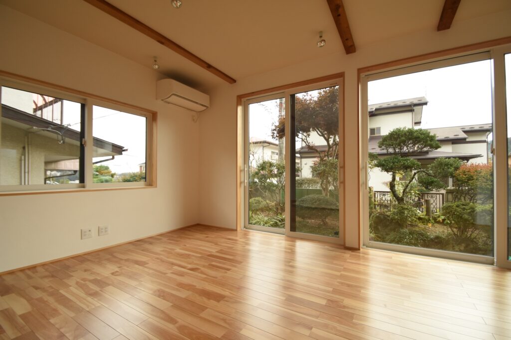 もともと和室だった空間は光の行き渡る明るいリビングルームに。天井の梁を現しにすることでアクセントに。