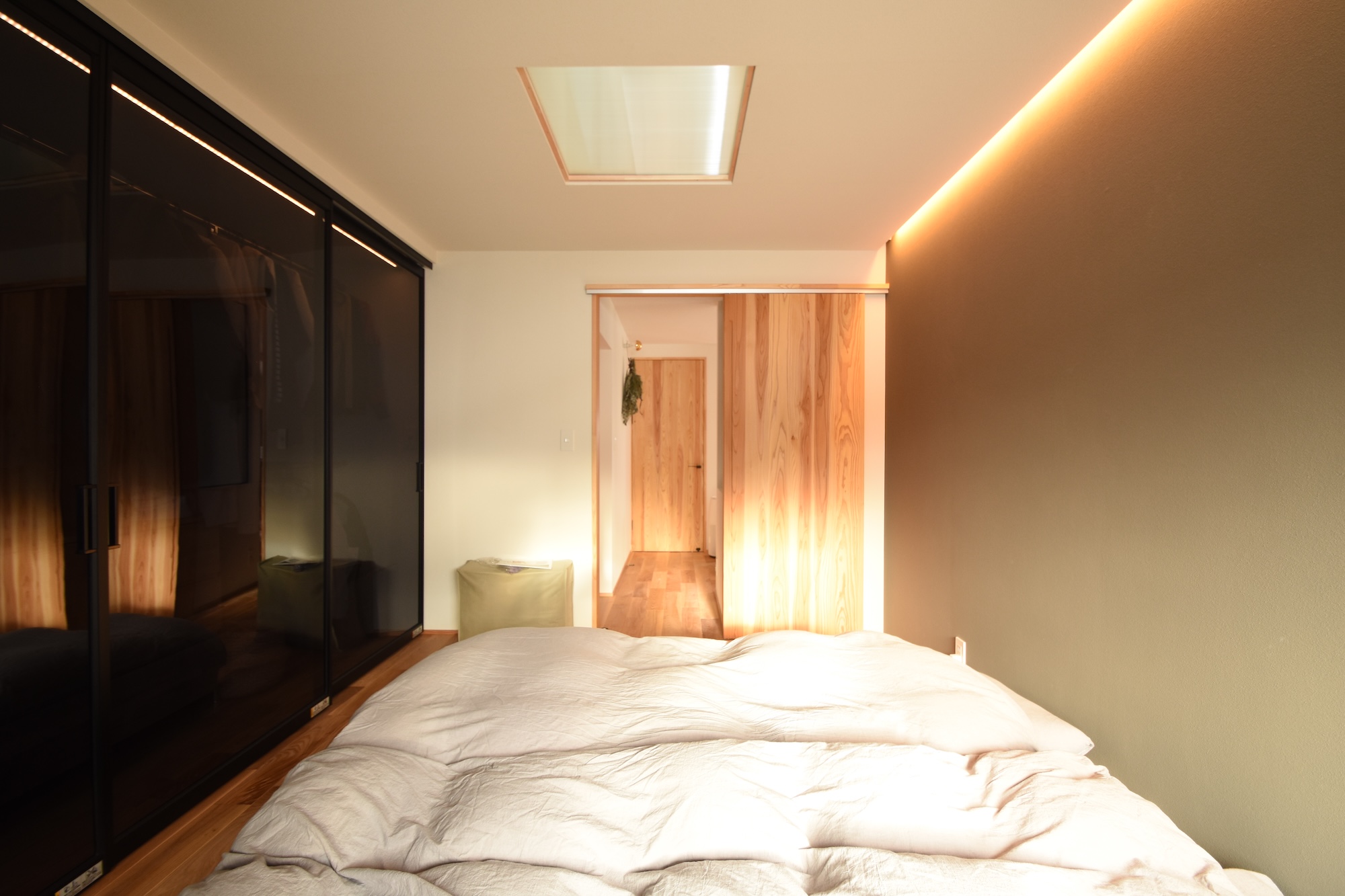 無垢の木の色や間接照明が心地よい明るさを感じさせてくれる主寝室。スモークガラスで仕切られたクローゼットもおしゃれ。