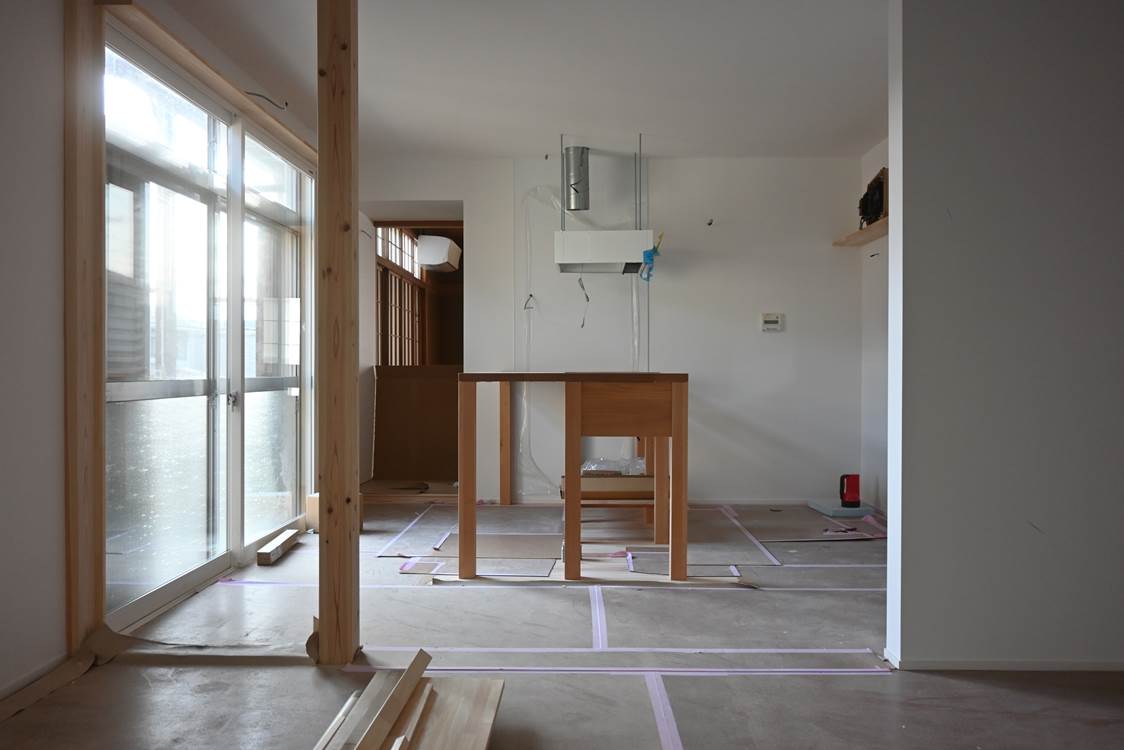 アイランドキッチンの背面には収納も設置されます。養生紙を剥がすと無垢の杉材の床があらわれます。