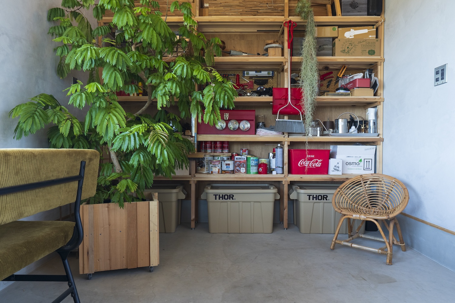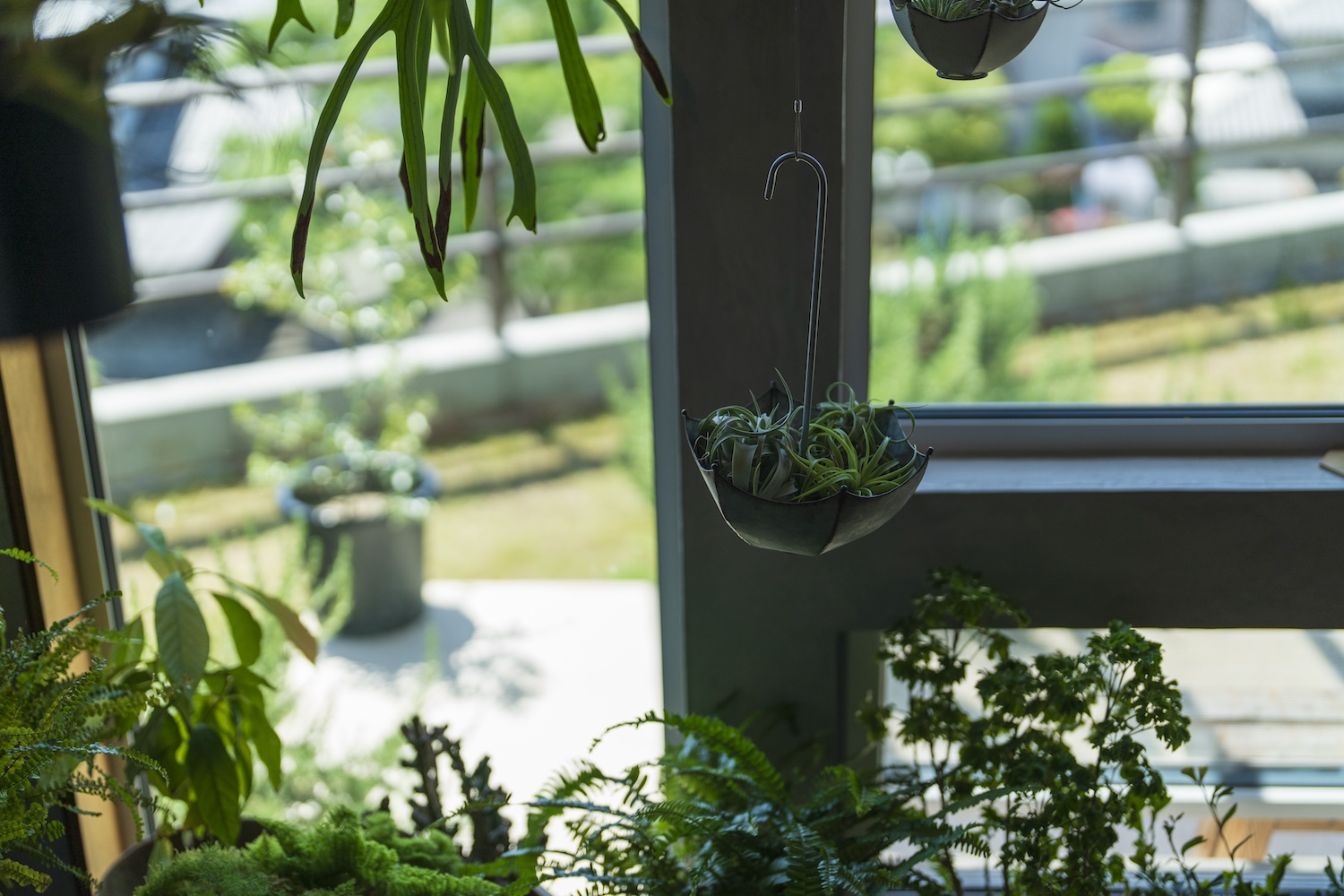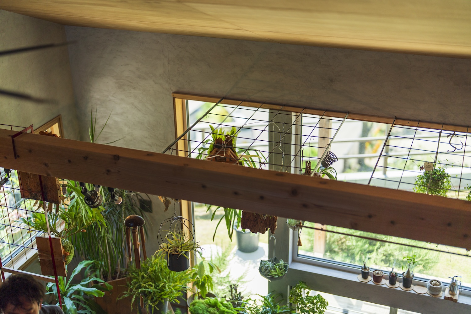 DIYで作ったとはとても思えない本格的な家具と、陽光が差し込む土間にイキイキと育つ様々な観葉植物が特徴的なお住まいです。
