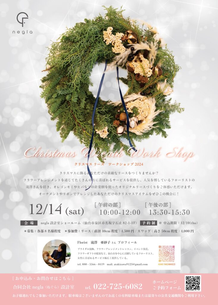 この度、12月14日(土)negla設計室ショールームにて、クリスマスワークショップ2024を開催します。