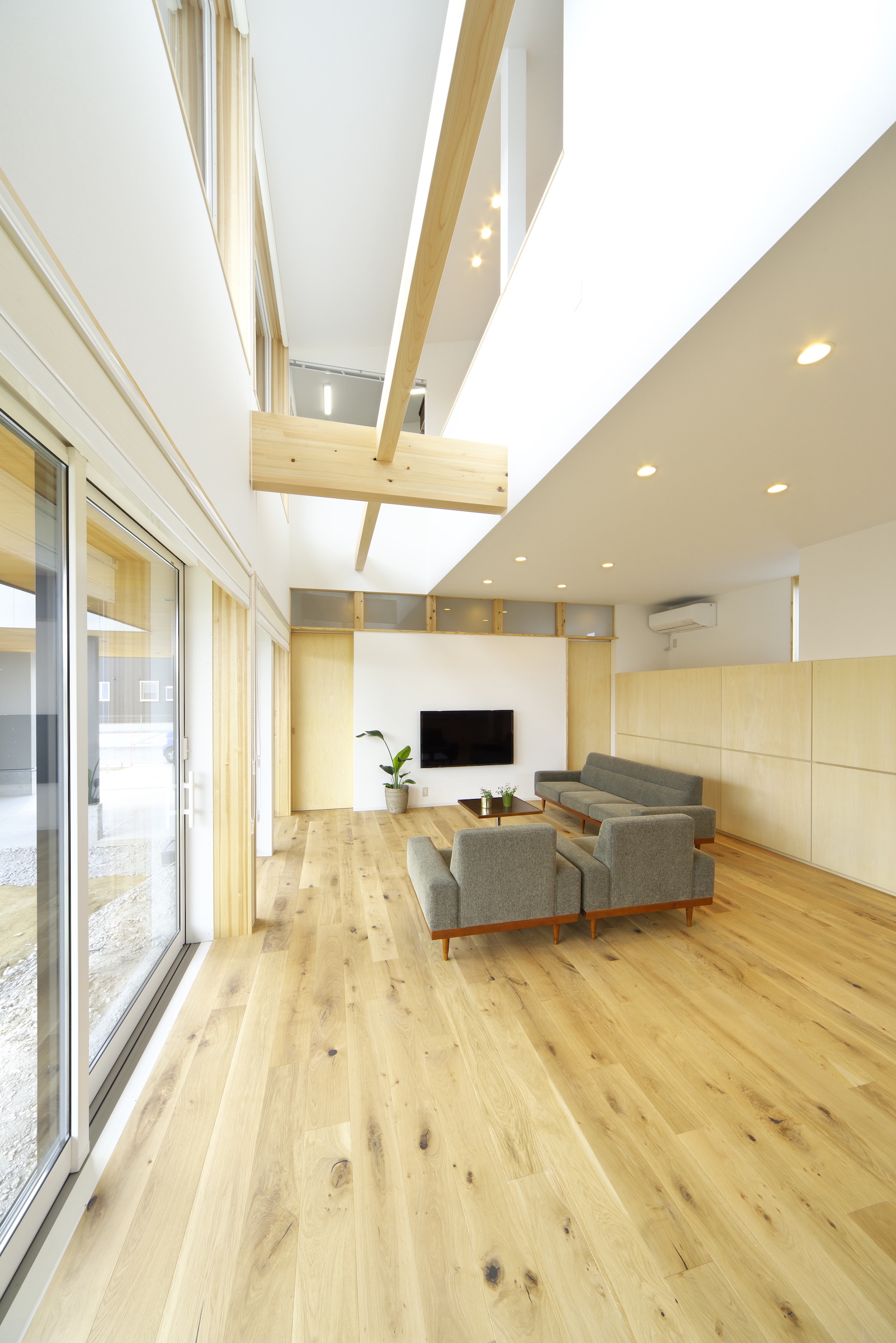 1階は仕切りを設けないフルオープンな空間ながら、高い住宅性能とヒートポンプ技術を利用した床暖房によって、省エネで冬も暖かい快適環境を実現