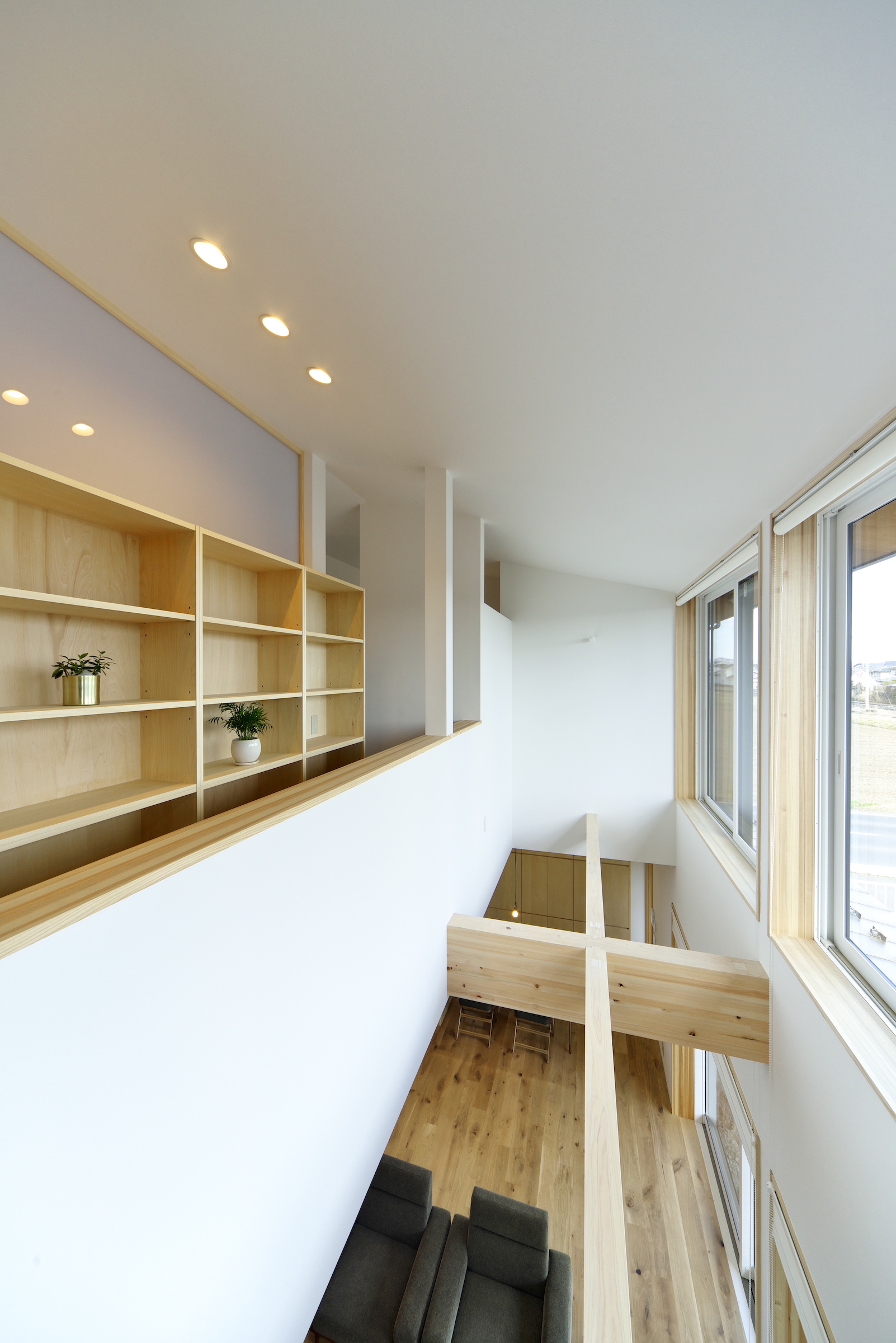 2階には大容量の造作本棚を設置。吹き抜けを通して1階にいる家族の気配を感じられるのも◎