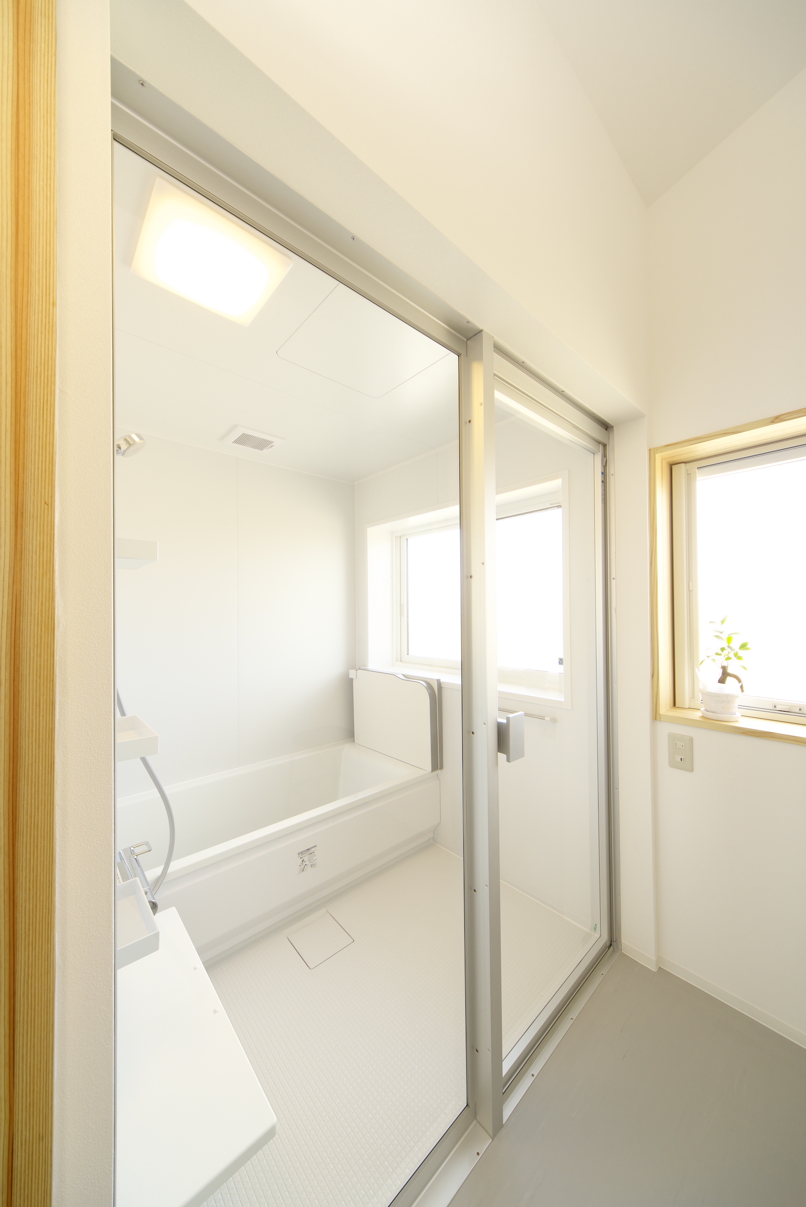 浴室のドアを透明にすることで脱衣室との境界がなくなり、より開放的な空間に