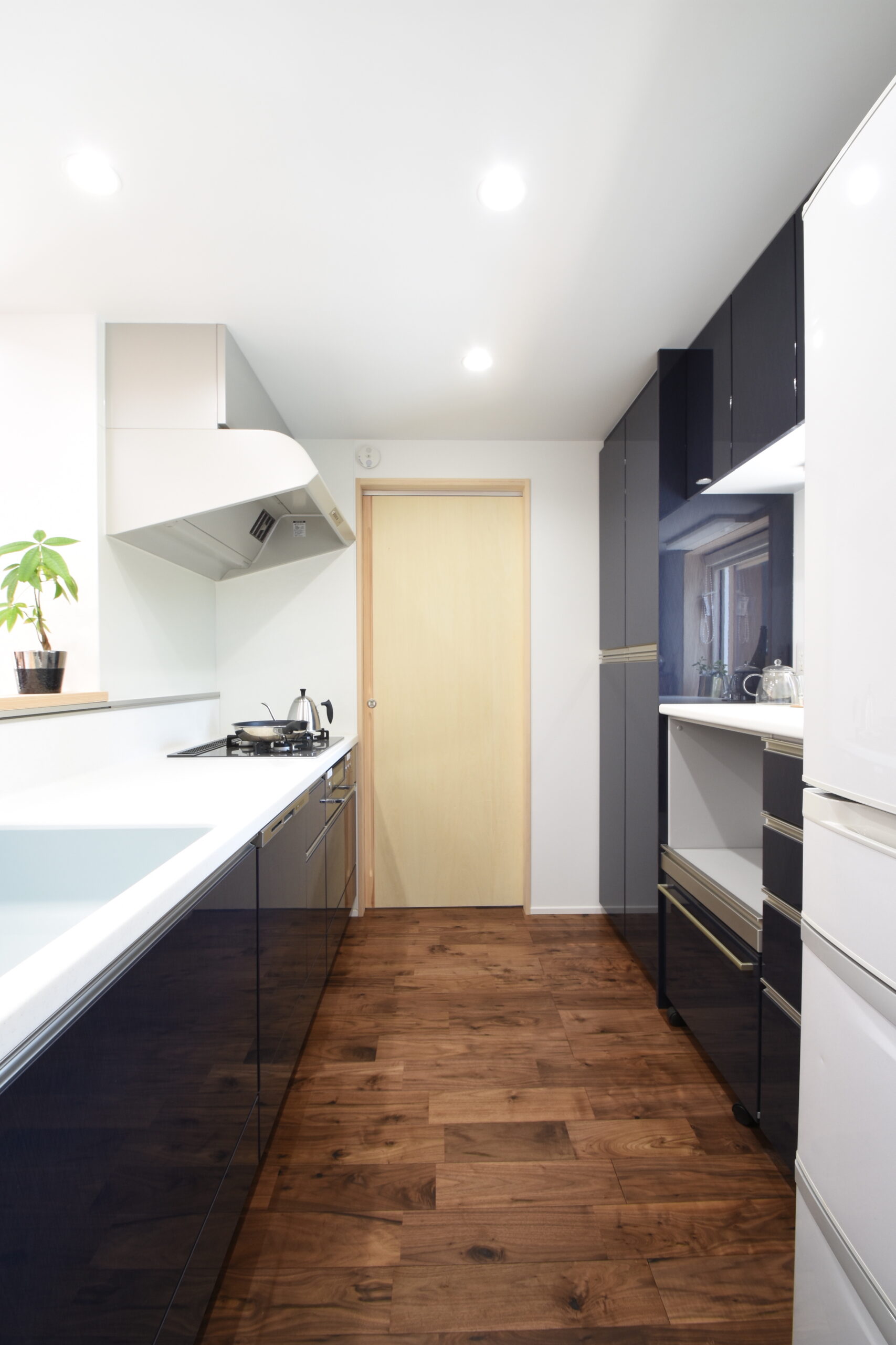 スッキリとしたネイビーカラーで統一されたキッチン。建具の奥はバスルームへ続く