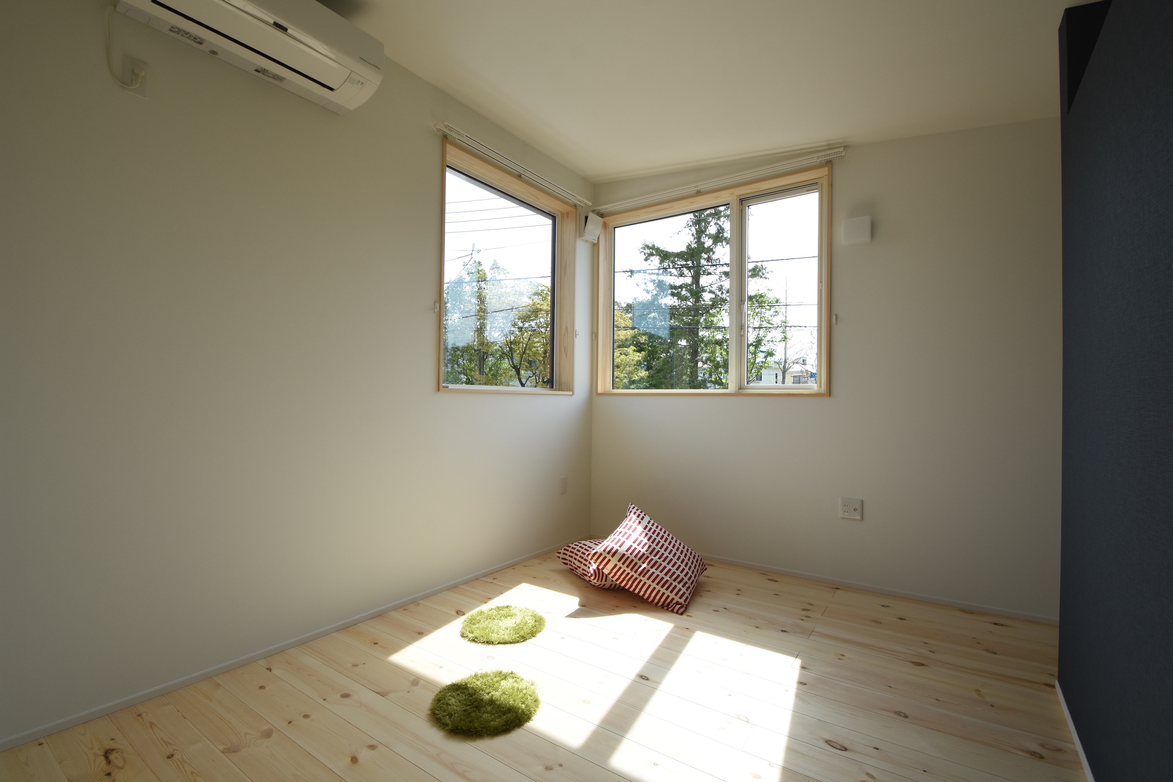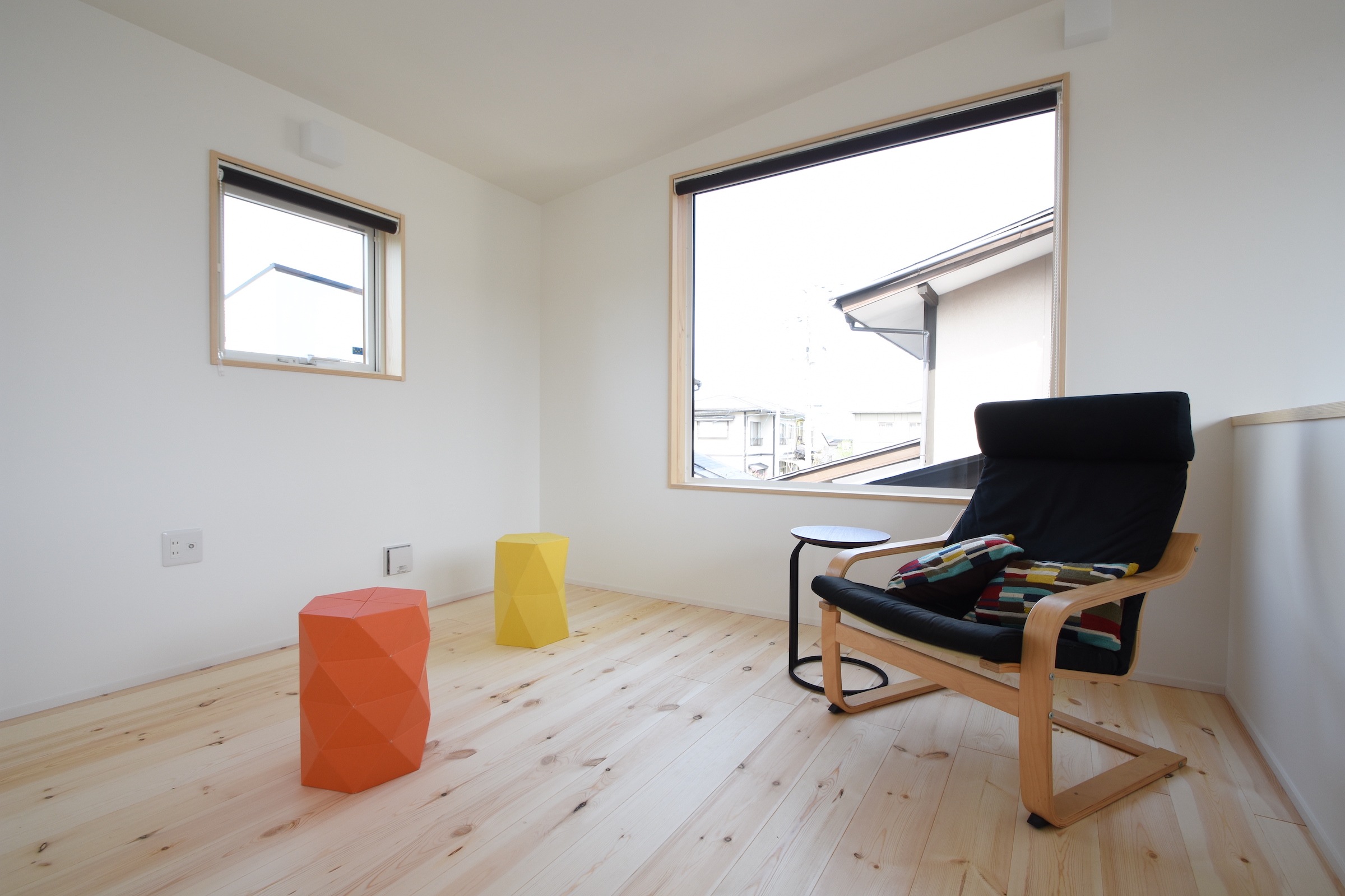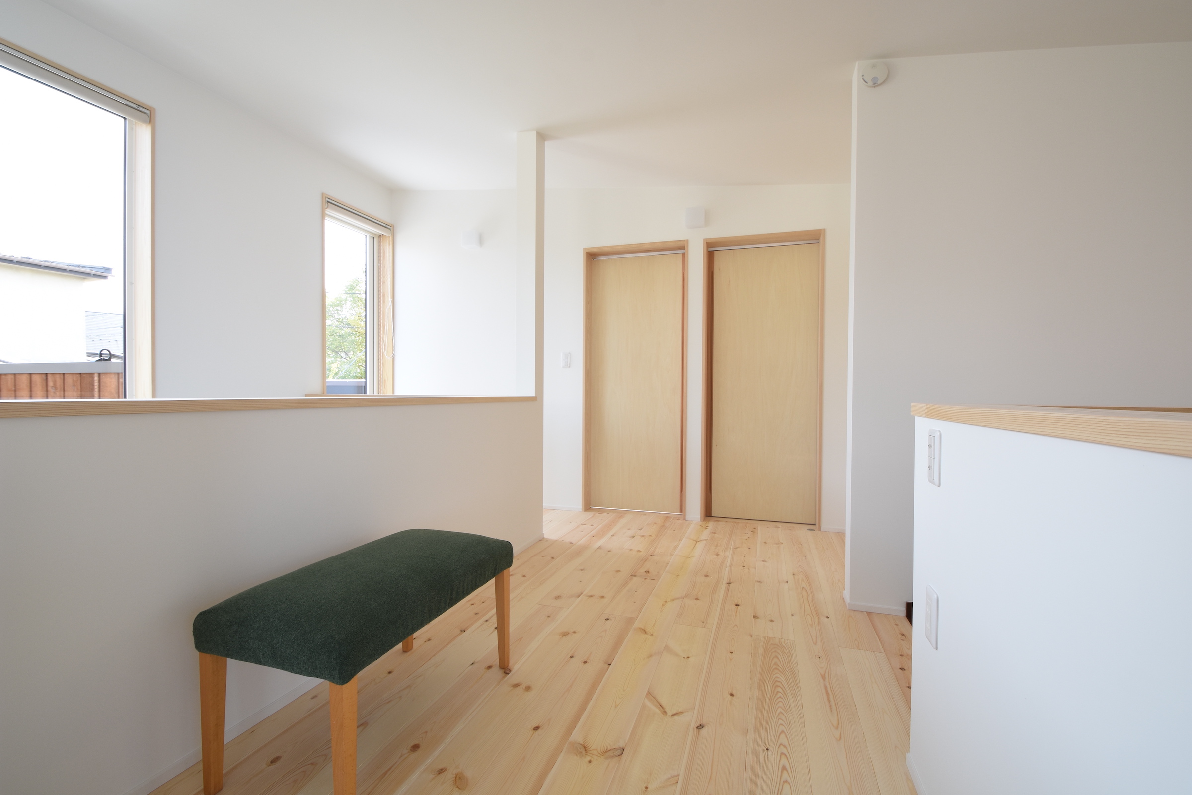 窓から光が差し込み、いつも明るい2階ホール。無垢の木の床が心地よい