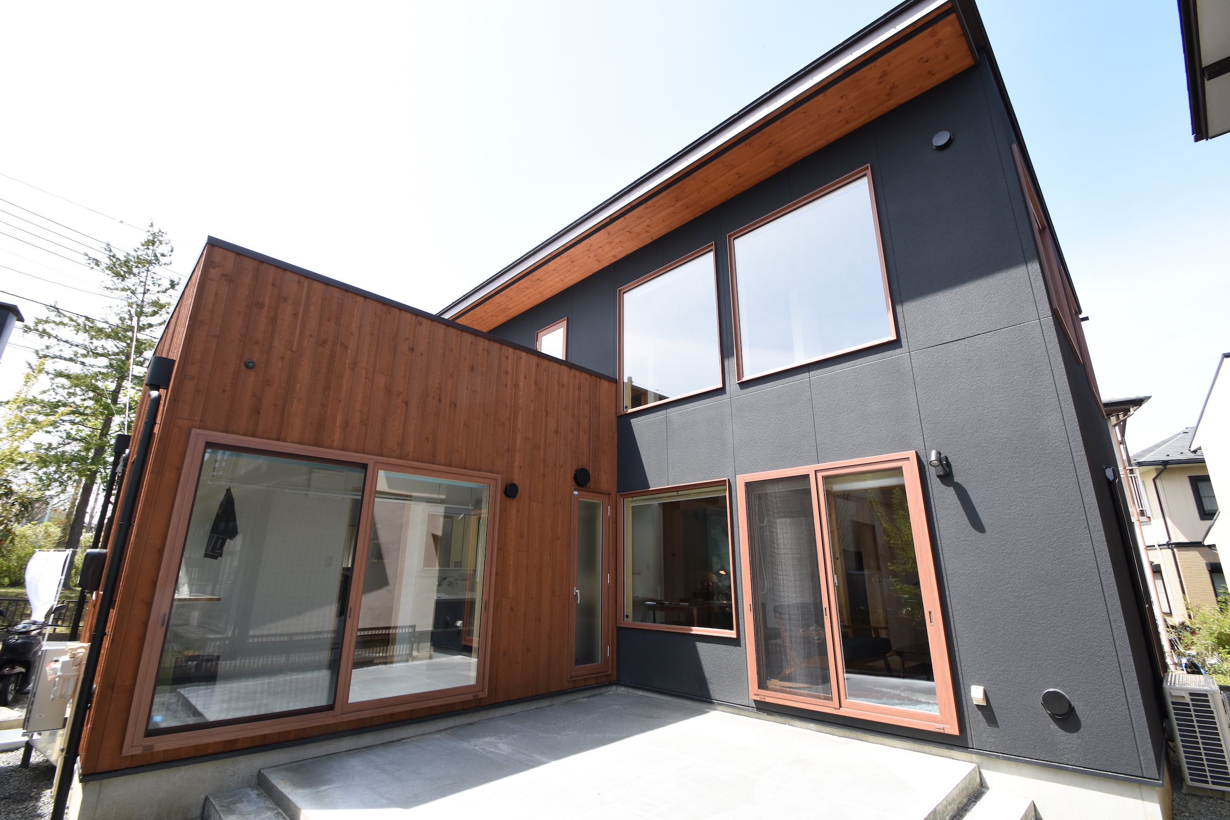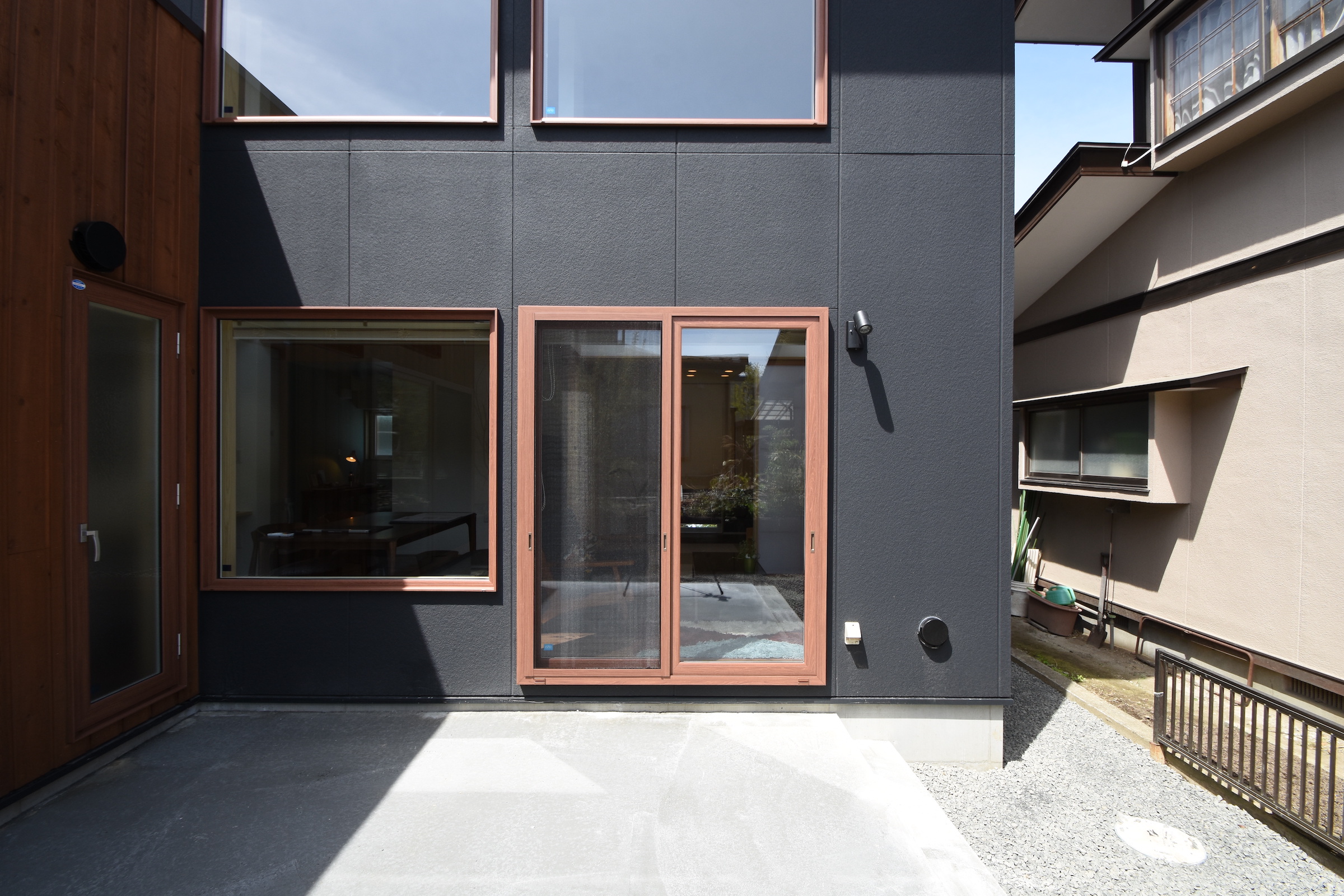 庭は建物をL字型にすることで、外からの目線を気にせず過ごせるよう設計。外壁の黒と板張りのコントラストが美しい外観