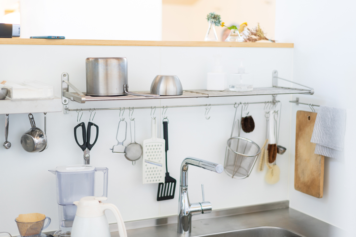 キッチン脇の壁は掛ける収納、貼る収納として大活躍。自分流にカスタマイズしていけるのが利点だ