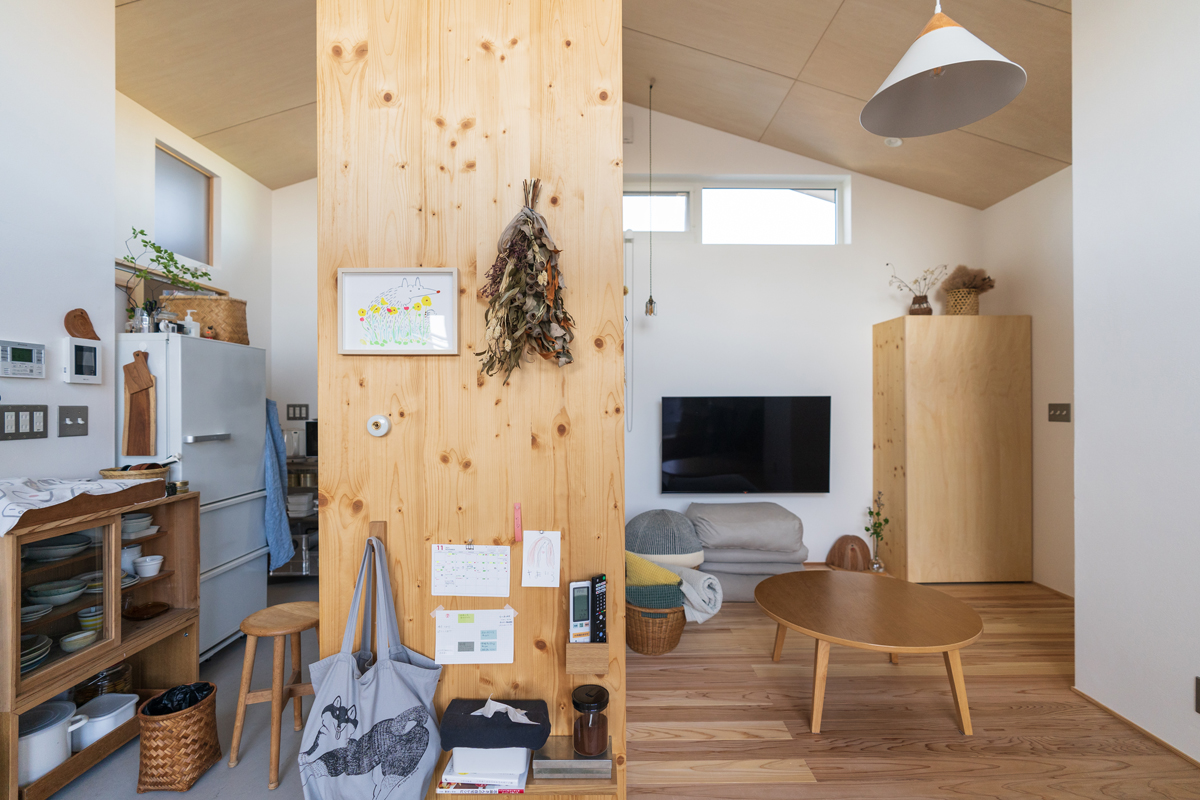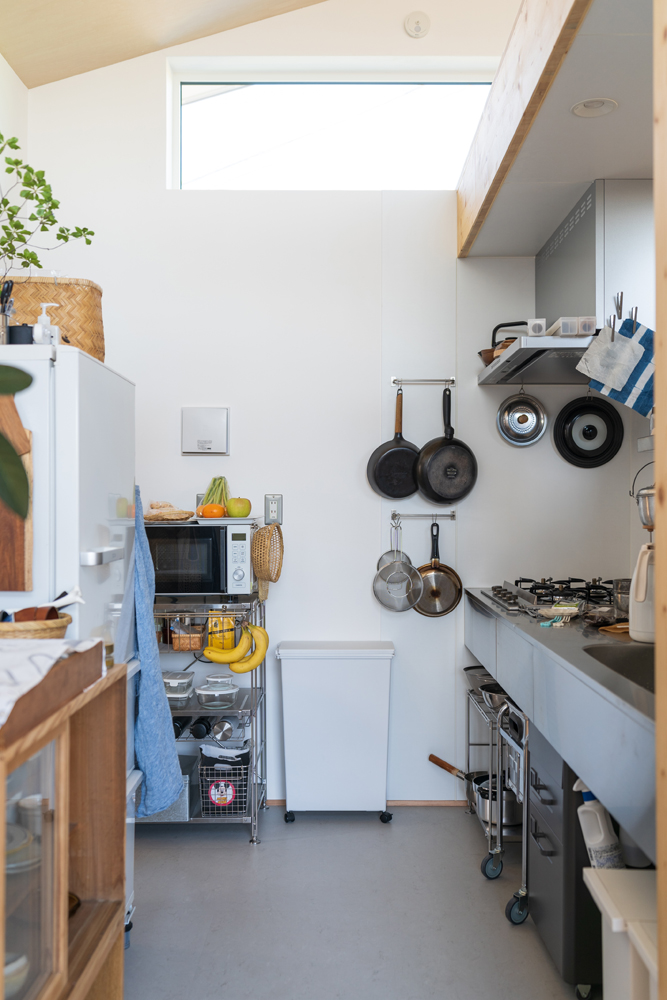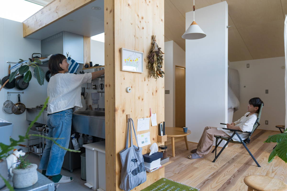 室内はワンルームながら、キッチンは立ち上がりを高く設定し、寝室にはカーテンを付けるなどして緩やかに区切れる空間に。また、ベンチとしても活用できる南側の出窓、居室の床と同じ高さにすることでアウトドアリビングとしても使える土間デッキなど、限られた空間を有効活用する工夫も盛り込んでいます。コンパクトで使い勝手良く、つながりながらも“こもり感”も得られる、自然体で暮らせる家が完成しました。