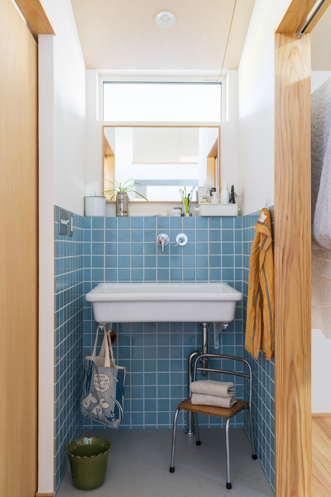 ハイサイド窓を設置した洗面台。青のタイルとむき出しにした実験用シンクがインダストリアルな趣を醸す