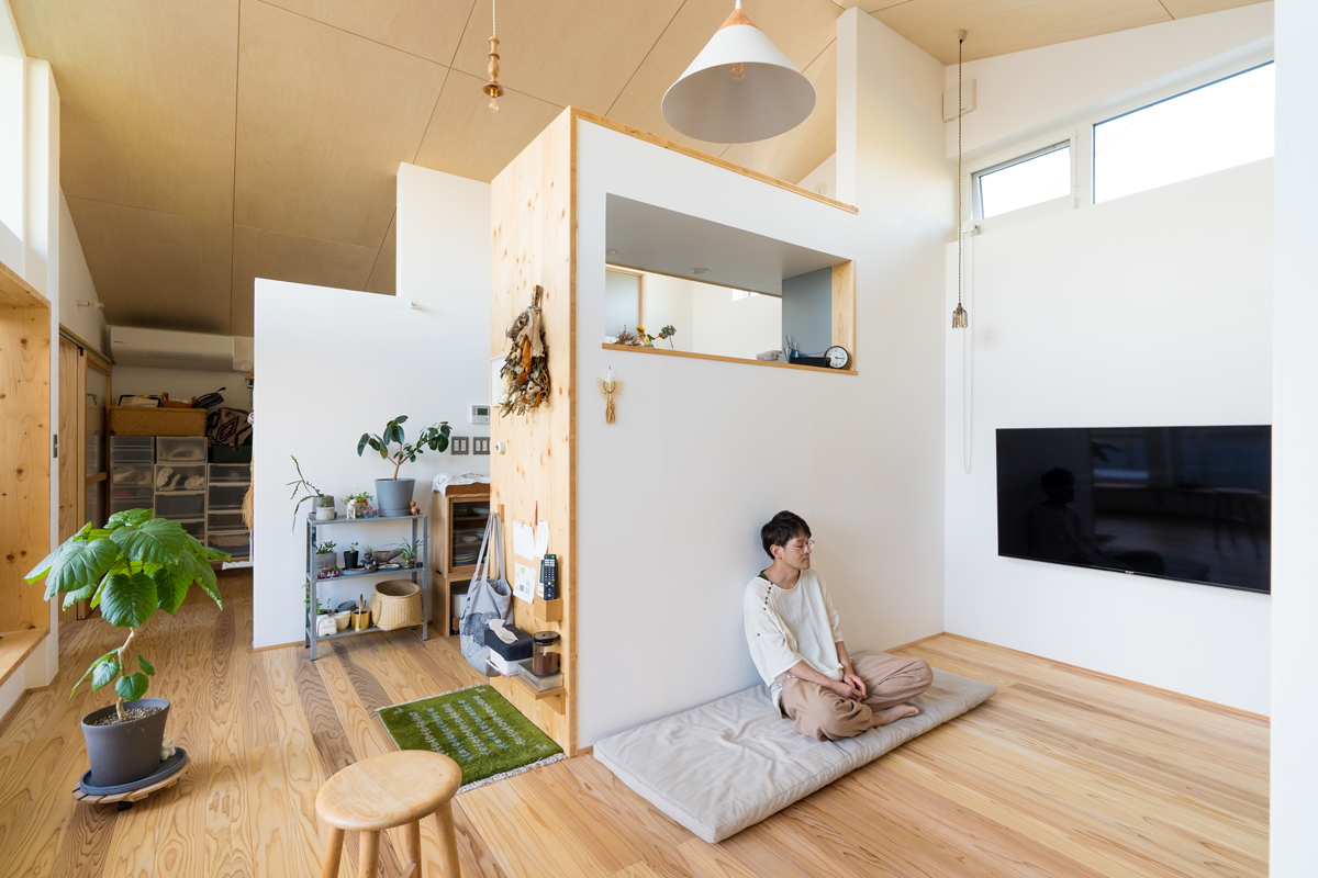 越後杉の無垢フロアと漆喰壁が調和するリビング。天井にはシナベニアを張り、すっきり美しく仕上げた
