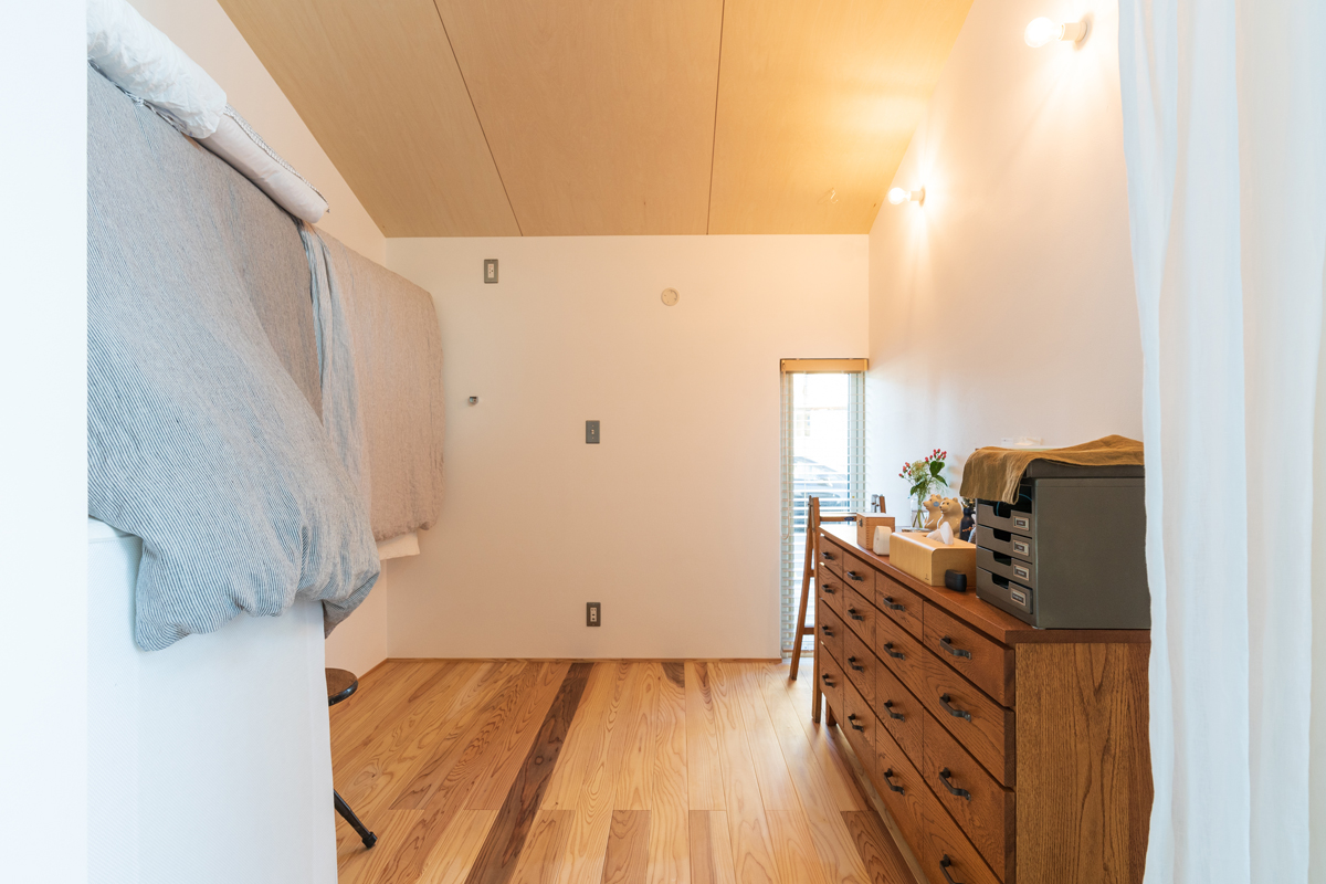 カーテンで緩やかに区切ることができる寝室。柔らかな色味の自然素材が穏やかな印象をつくる
