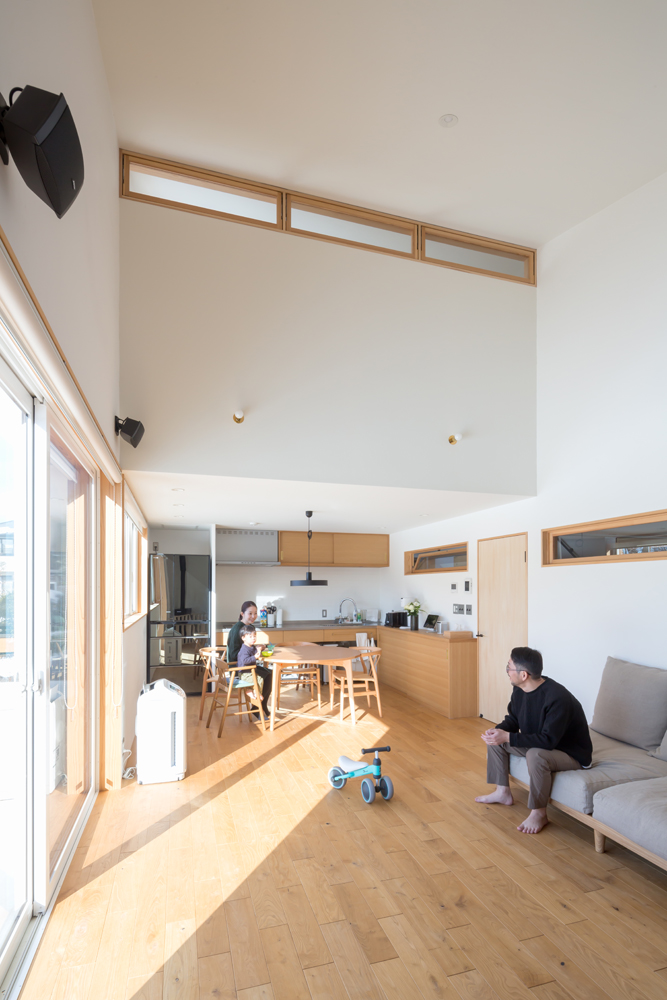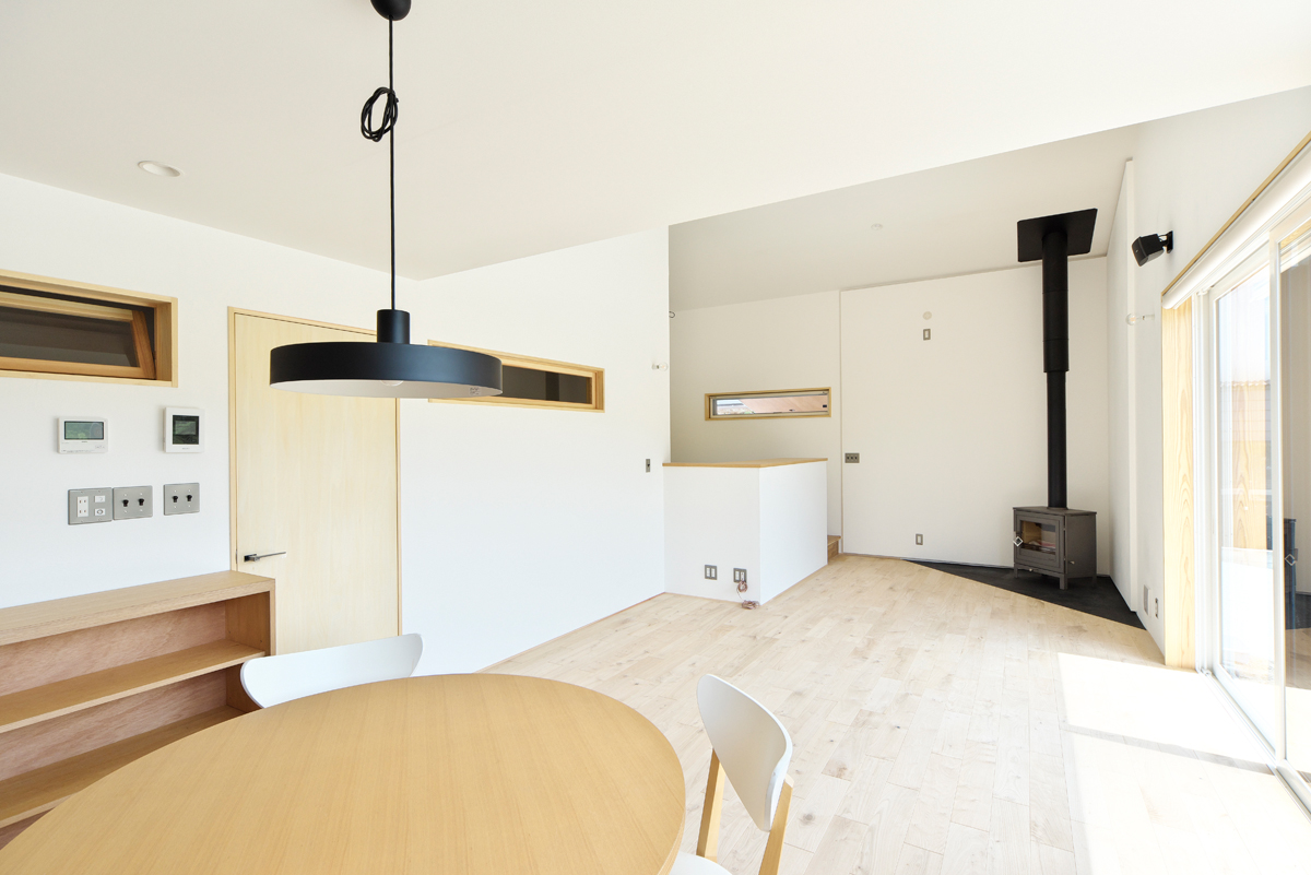 南西に広がる森を借景として取り込み、バーベキューやおうちキャンプも楽しめるプライベートガーデンを確保。建物は森と平行に配置し、リビング、ダイニング、キッチンのどこにいても窓から緑豊かな風景を見渡せるようプランニングしました。内装も周囲の景観に合わせ、木と漆喰をふんだんに使ったナチュラルな佇まいに。陽射しがたっぷりと入り込む明るい空間を、冬はご主人こだわりの薪ストーブが暖めます。森の緑に見守られ、伸びやかな暮らしを満喫できる住まいです。