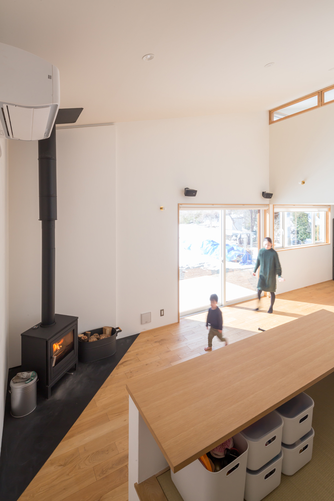 薪ストーブが鎮座するリビング。吹き抜けを通し、冷暖房も効率的に循環する空間構成となっている