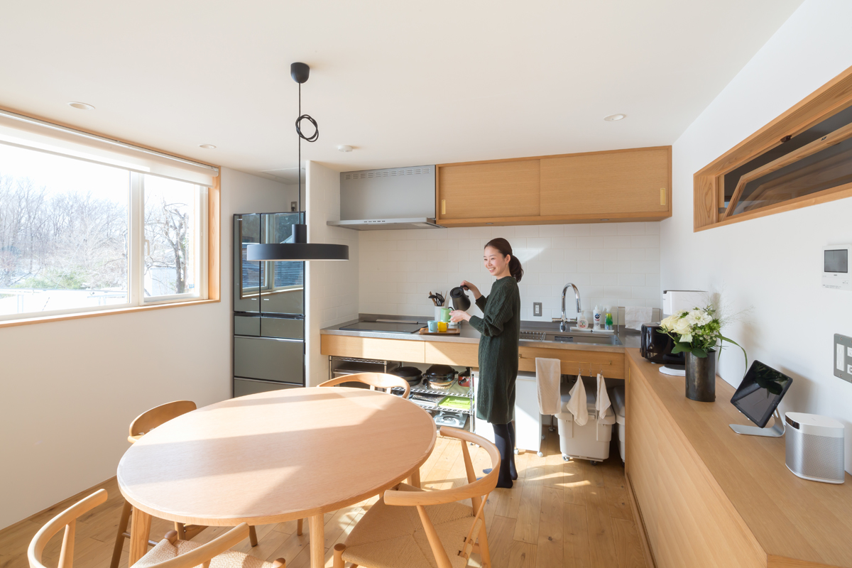 使い勝手の良さを追求して細かく設計された造作キッチン。窓から四季折々の森の眺めも楽しめる