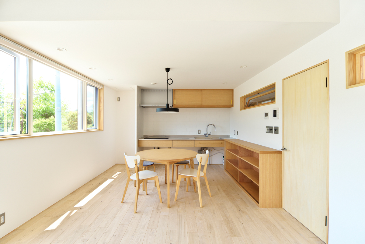 クリ材の床や漆喰の壁といった自然素材に包まれた空間。キッチンはリビングを少しでも広く取るため壁付けを選択