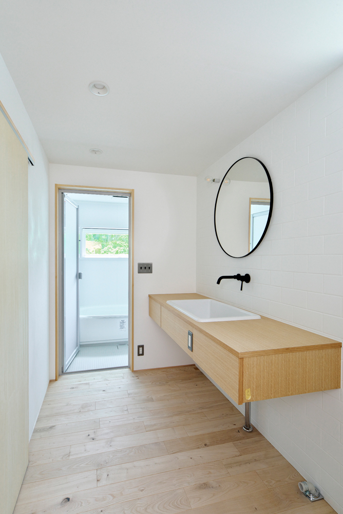 埋め込み式の蛇口、真鍮製のシングルレバー、丸い鏡など、随所にこだわりが垣間見える造作洗面台
