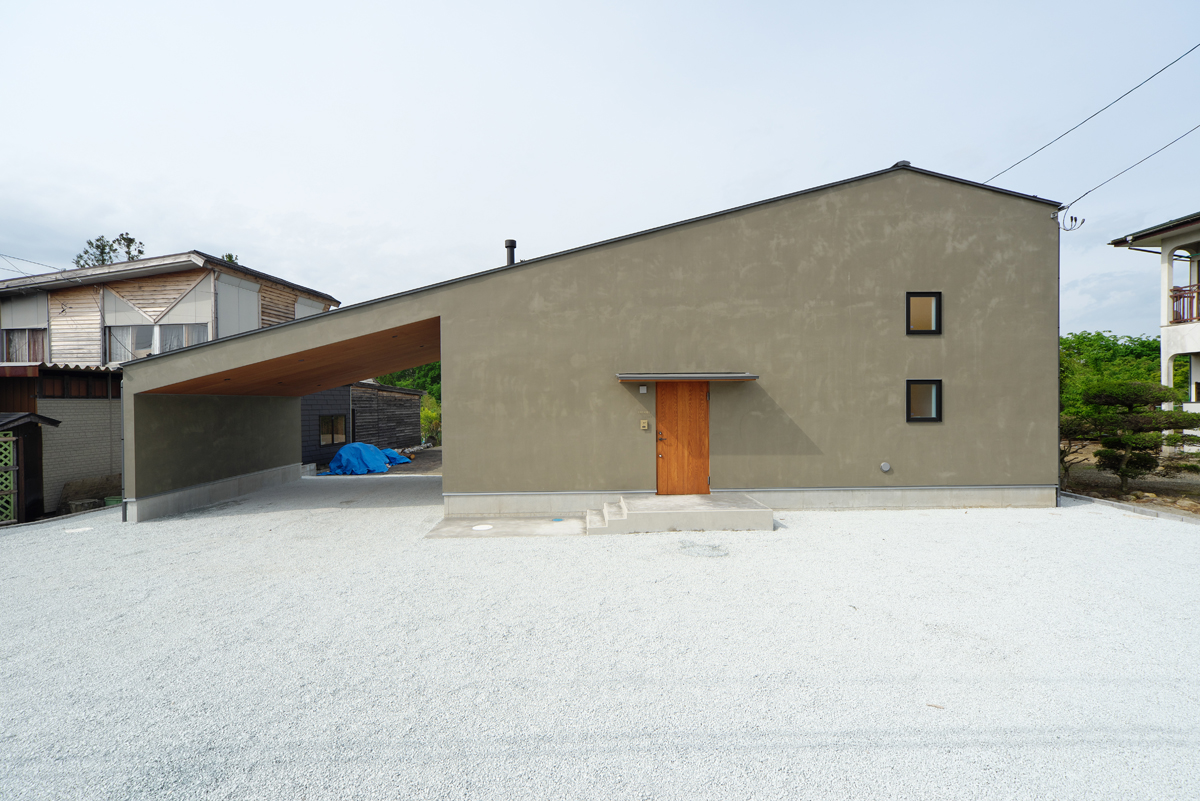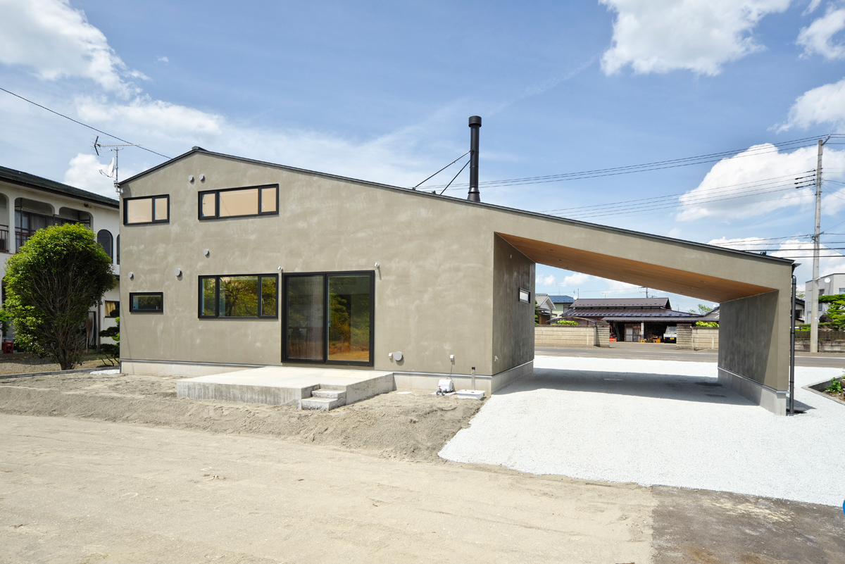 伸びやかな大屋根と総モルタル塗りのスタイリッシュな外観。道路に面した北側は意匠性とプライバシーに配慮し窓は少なめに