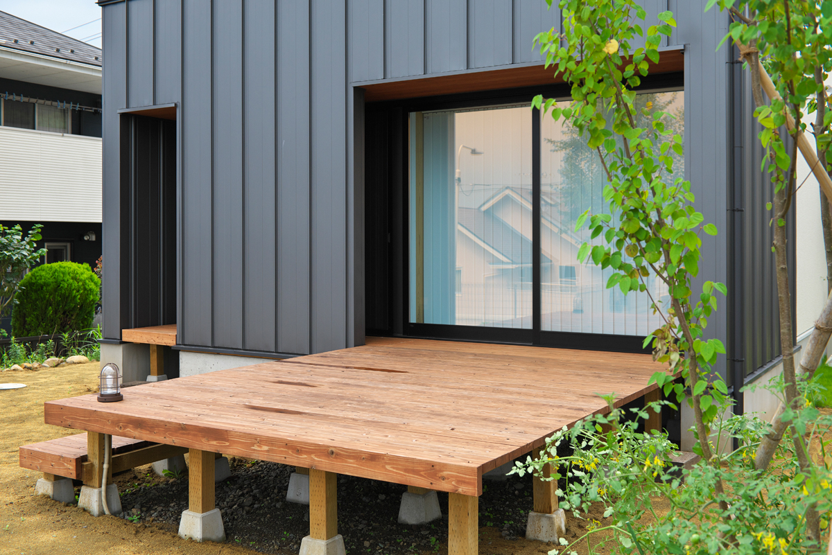 南面の掃き出し窓の外に大きなウッドデッキを設置。天気の良い日にはアウターダイニングにもなる
