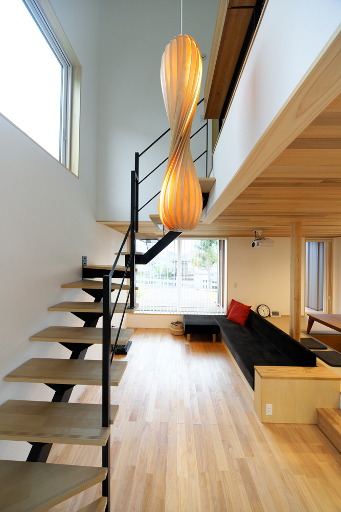 サクラの床材が美しいリビング。大きな吹き抜けに奥さんが一目ぼれしたという照明が彩りを添える