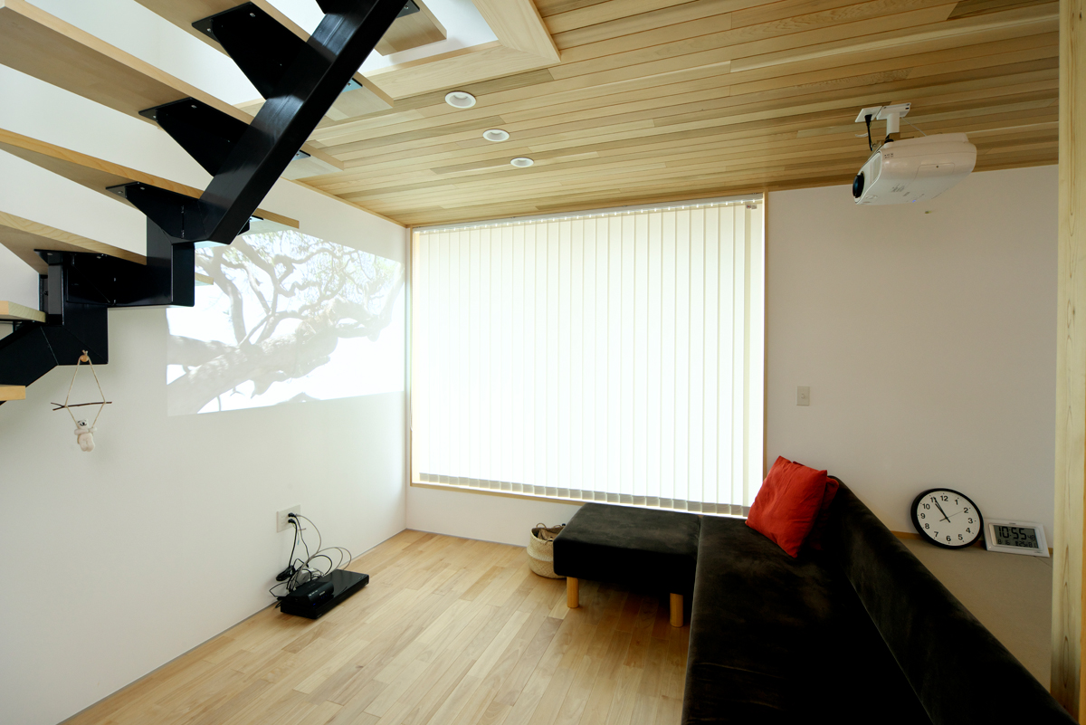 壁面に映像を大きく映し出すプロジェクターを採用し、テレビを置かないすっきりとした空間に