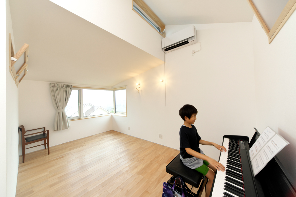 高低差のある敷地に立つWさん宅。道路側から奥まるにつれて土地が高くなっているため、建物自体の高さを抑えつつ、大きく伸びやかに見える大屋根を採用しました。車好きのWさんのために、建物と一体化したインナーガレージも備えています。