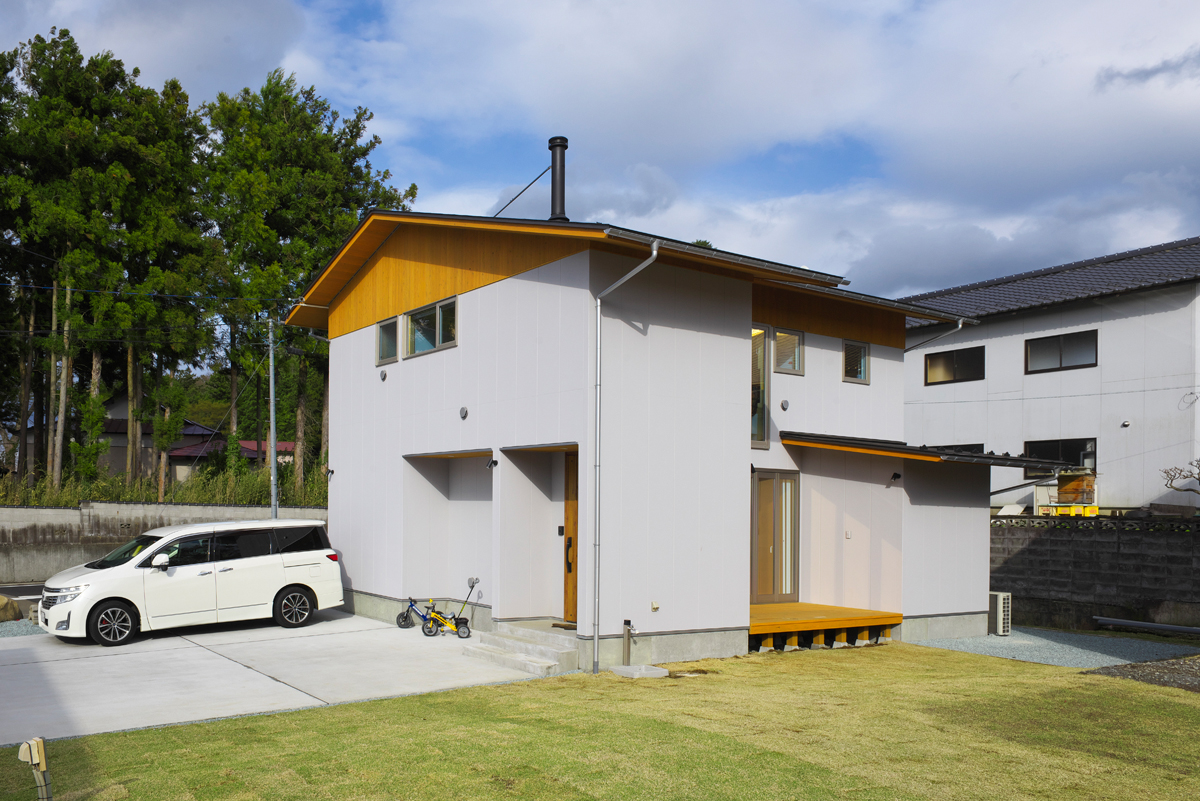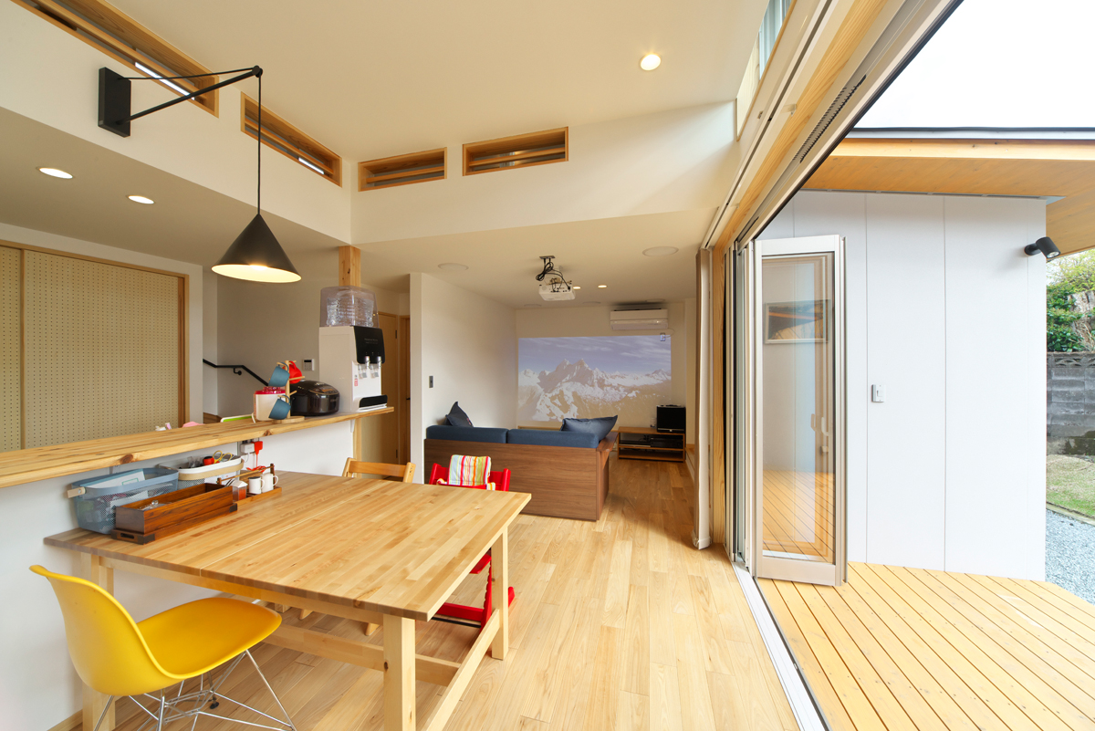 実家が立つ広い敷地の一角に新居を建てることを希望したYさん。若いご一家の生活と実家との距離感を踏まえ、建物をコの字型に配置してウッドデッキを囲み、プライベートな空間としました。全開口の窓を開ければLDKとの一体感が生まれ、室内外を分け隔てなくつなげるアウターリビングとしても使える楽しいスペースへと早変わりします。