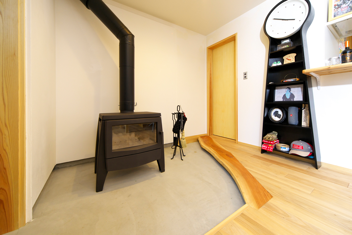 玄関土間には高性能な薪ストーブを設置。上がり框には贅沢に無垢の一枚板を使用している