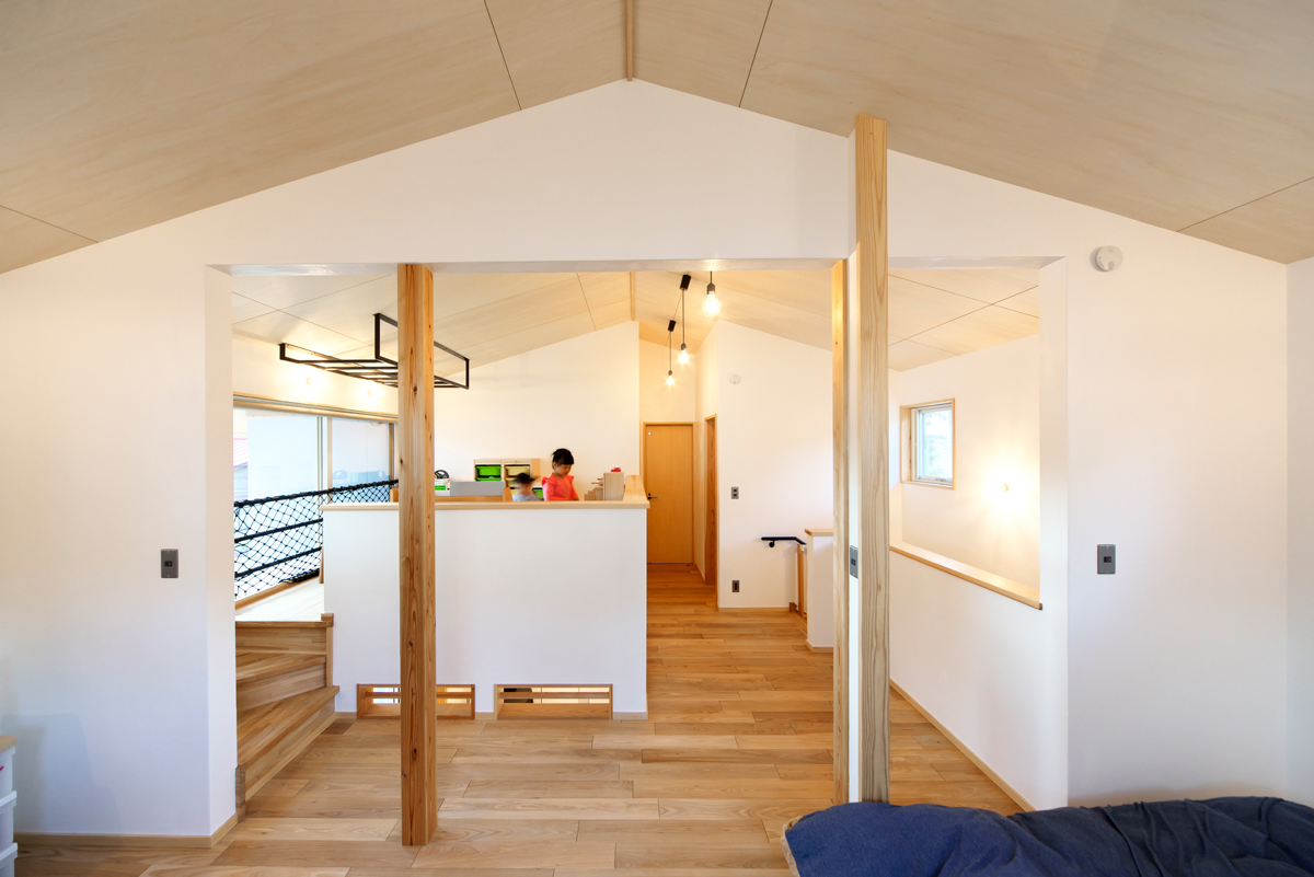 2階ホールにはスキップフロアを設置。雲梯を設け、お子さんの遊び場や洗濯物干し場としても重宝する