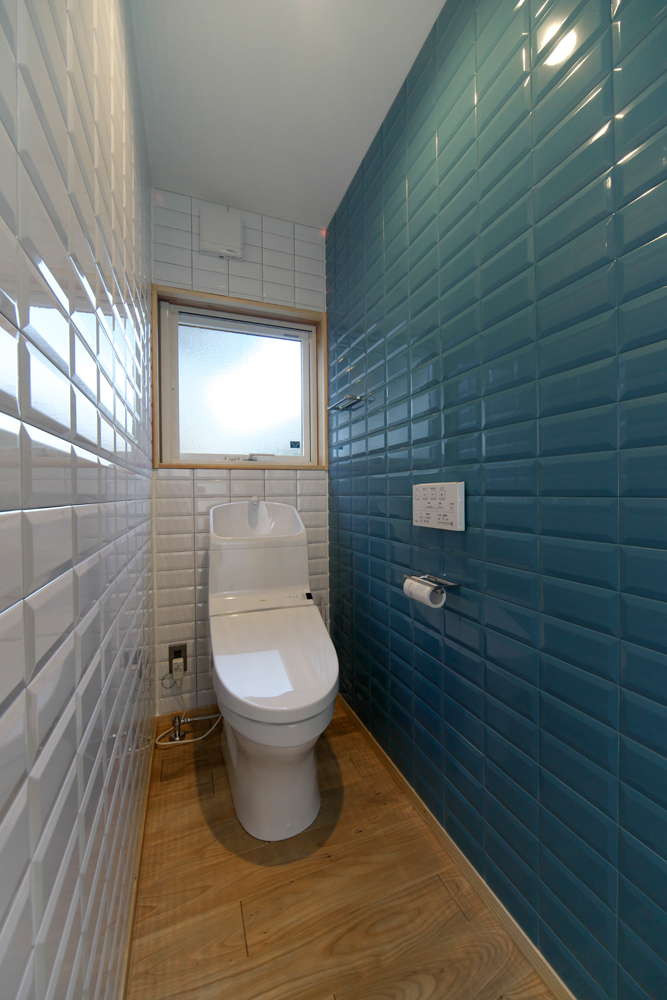 奥さんが選んだ青と白の2色のタイルを施したトイレ