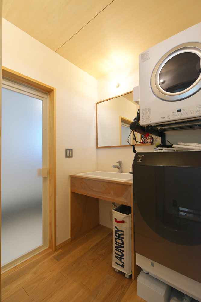 2階洗面脱衣室。洗濯をし、スキップフロアに干し、寝室のクローゼットに収納するという動線も考え抜かれている