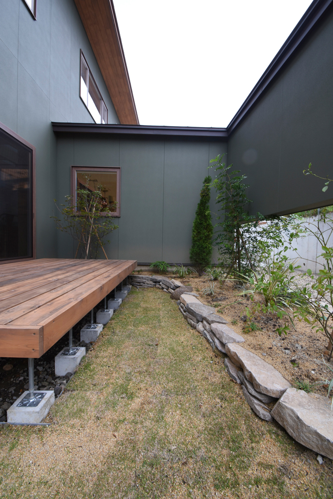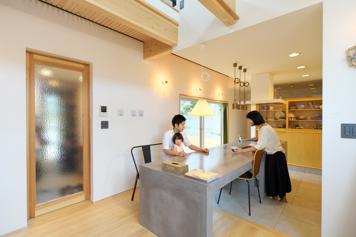 1階はキッチンを中心にリビング・ダイニング、和室、浴室を仕切らずに配置し、広がりのある空間をつくり出しています。また、玄関を張り出させ、袖壁を伸ばすことで、奥にある庭やウッドデッキにプライベート感を演出しました。ウッドデッキはダイニングの窓を開けるとアウターダイニングに早変わり。周囲の目を気にせず、外とのつながりを楽しめる空間構成が魅力です。