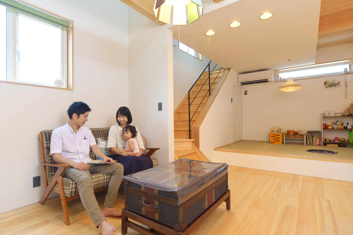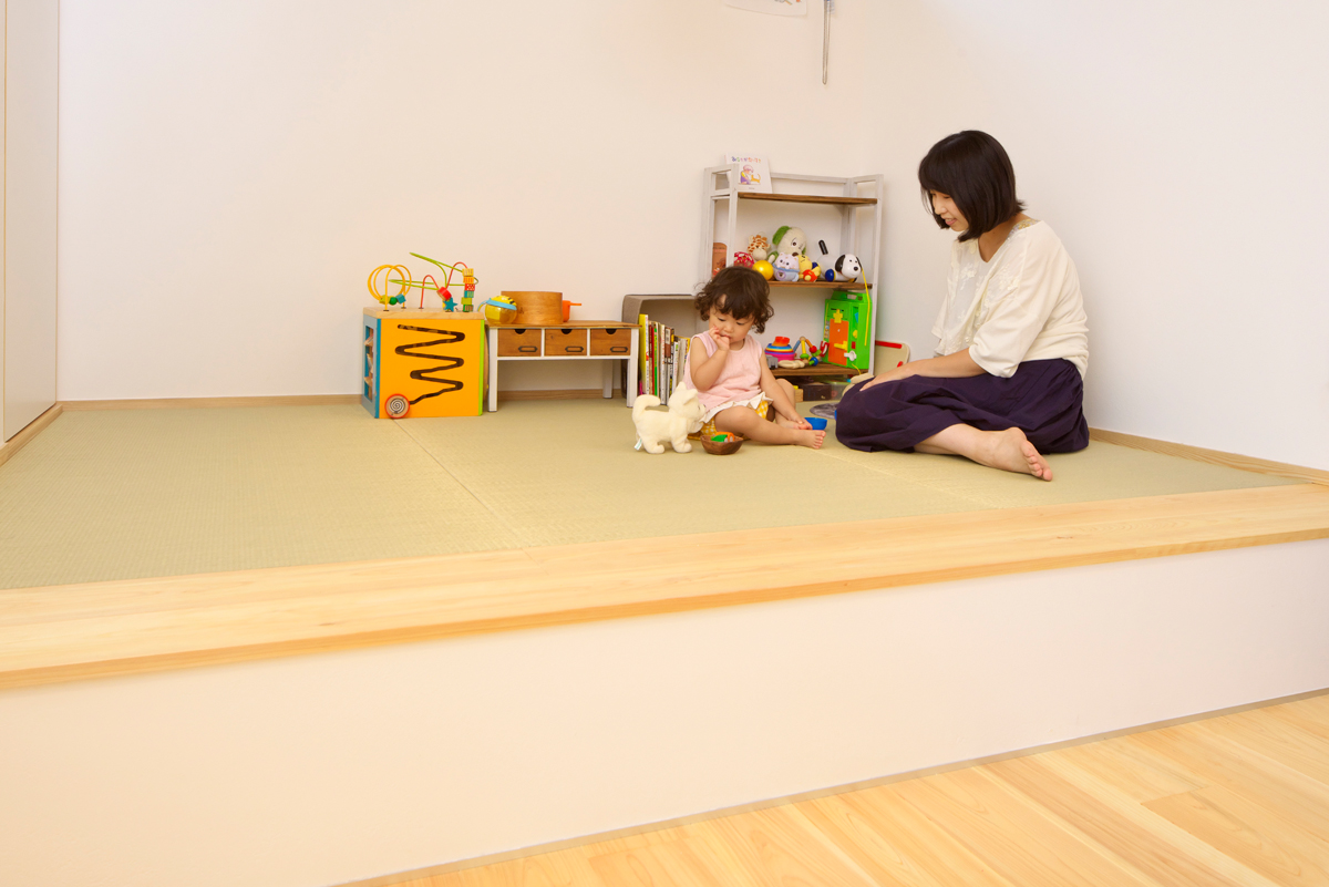 くつろぎの場所として、またお子さんの遊び場として設けた畳スペース。奥には大容量の階段下収納が備わる