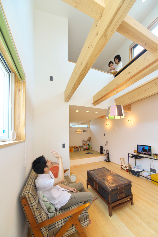 上部からも1階に陽射しを届けるため、2階のホールと子ども部屋をつなぐ廊下にはすのこ床を採用。吹き抜けは将来的に床を張って部屋とすることができるなど、長く住まえる工夫も盛り込んでいます。