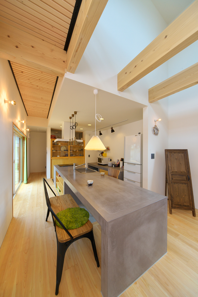 センターキッチンのプラン。2階のすのこ床の廊下からも光が降り注ぎ、明るさも申し分なし