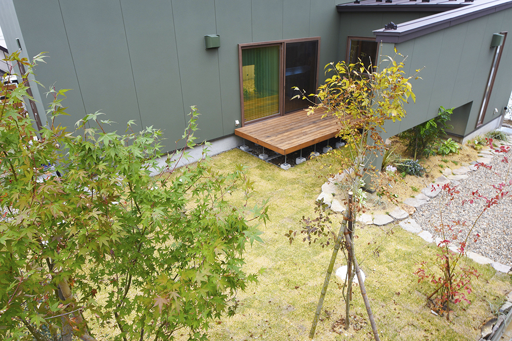 東西に広がる長方形の敷地に立つIさん宅。建物を北側に寄せて庭を確保しつつ、南からの陽光をたっぷりと取り込める横長のプランとしました。