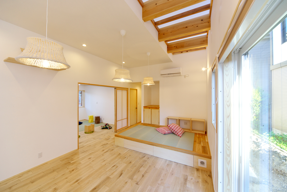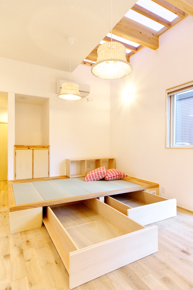 1階LDKに併設された引き出し収納付きの畳の小上がり。2階インナーバルコニーからは光が降り注ぐ