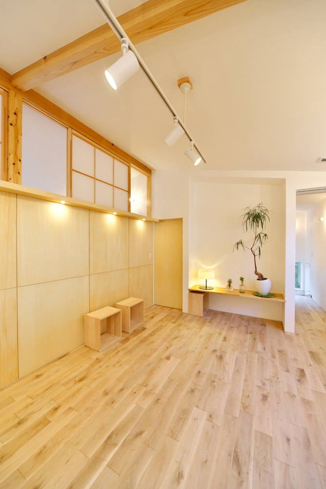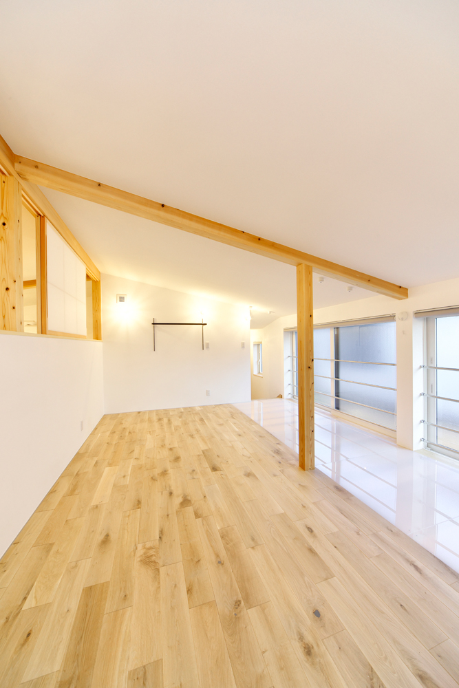 もう一つ重視したのが採光計画です。隣家が迫る環境の中で十分な光を取り込むため、2階インナーバルコニーの床に強化アクリルパネルを採用。2階からの光を1階リビングへと落とし込みます。また北側に設けた2階リビングには、上部の障子窓から明るさが届くようプランニングしました。