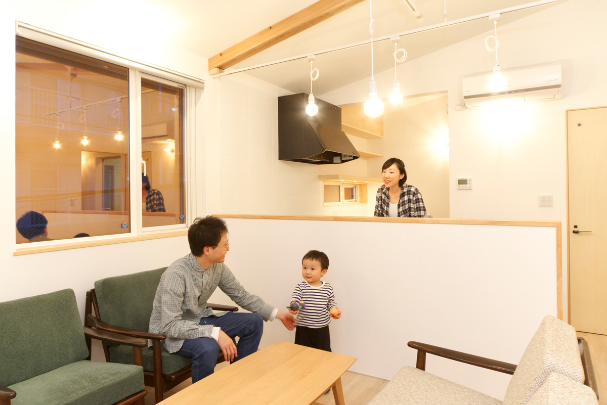 住宅密集地に立つ、7人家族のNさんの住まいです。1階はご両親やおばあさんたちが生活するスペース、2階はNさんたちご夫婦とお子さんが生活するスペースに分け、それぞれにLDKや水まわりをレイアウト。お互いの存在を感じながらも、世代ごとに異なるライフスタイルを楽しめる間取りとしました。