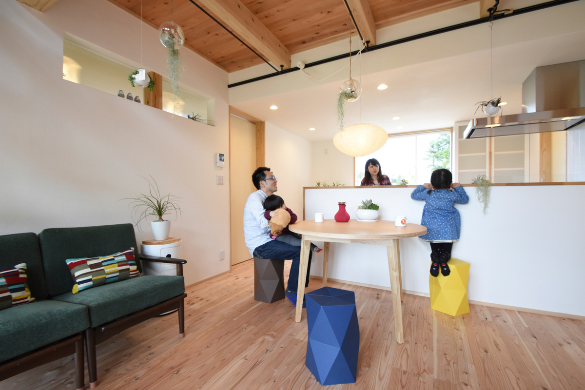 無垢材や漆喰の温かい質感に包まれるLDK。対面式のキッチンで家族の会話も弾む