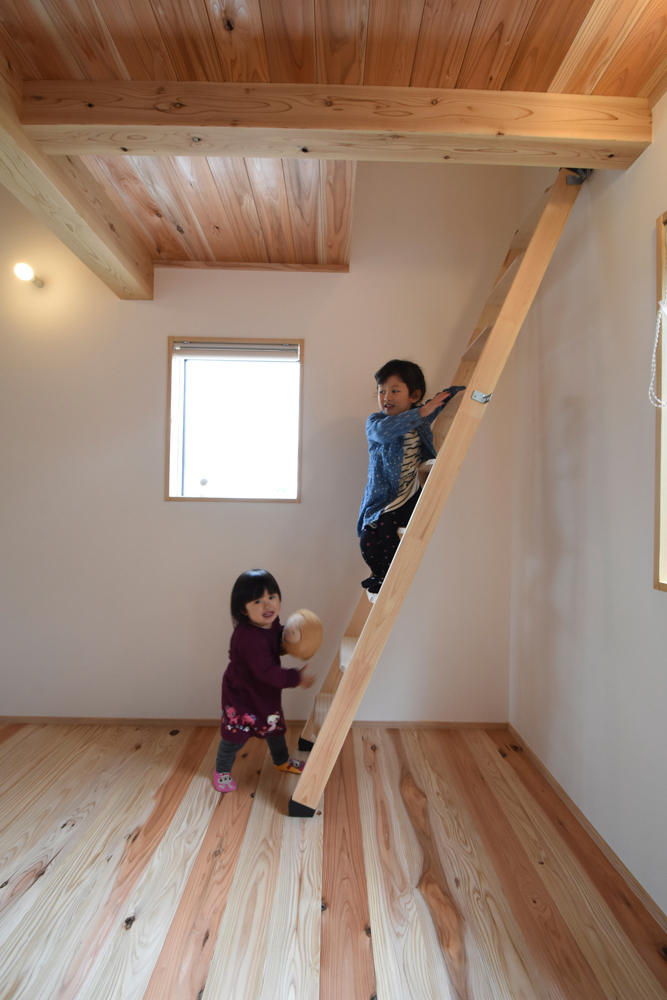 2階ホールの上部にははしごで上るロフトを設置。収納など多目的に使えるスペースだ