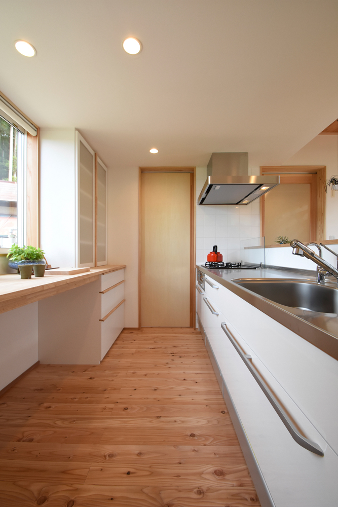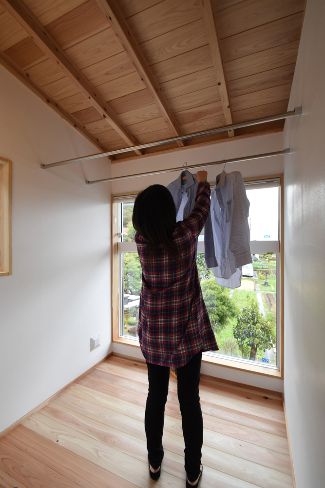 南側に開けた敷地のため、南面に採光や通風、景色を楽しむための窓を大きく設けた。隣には実家が立つ