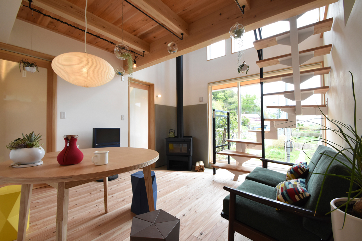 薪ストーブのぬくもりが全体に行き渡る吹き抜け空間。光を取り込めるよう、鉄骨のスリムな階段を採用