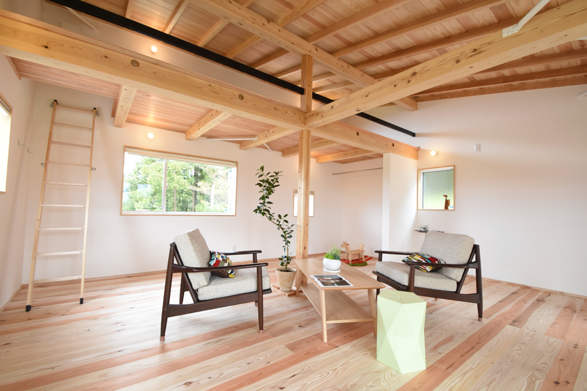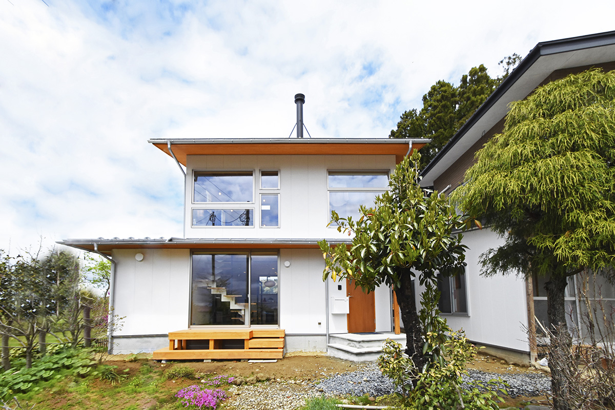 宮城県北の広々とした敷地に立つこのお宅。隣に実家があるため、あえてコンパクトな家を希望されました。室内にはスギの無垢材や漆喰などの自然素材をふんだんに使ったぬくもりあふれるスペースが広がります。
